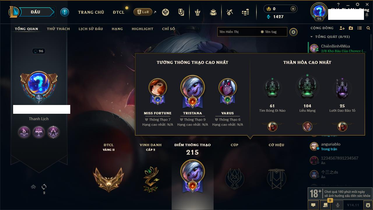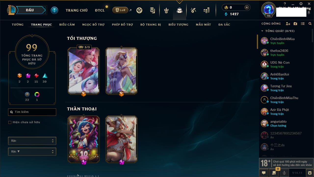 Rank Đơn: Vàng IVKhung: BạcTướng: 171 - Còn 426239 THXTrang Phục: 162Rank ĐTCL: Chưa RankLinh Thú: 33