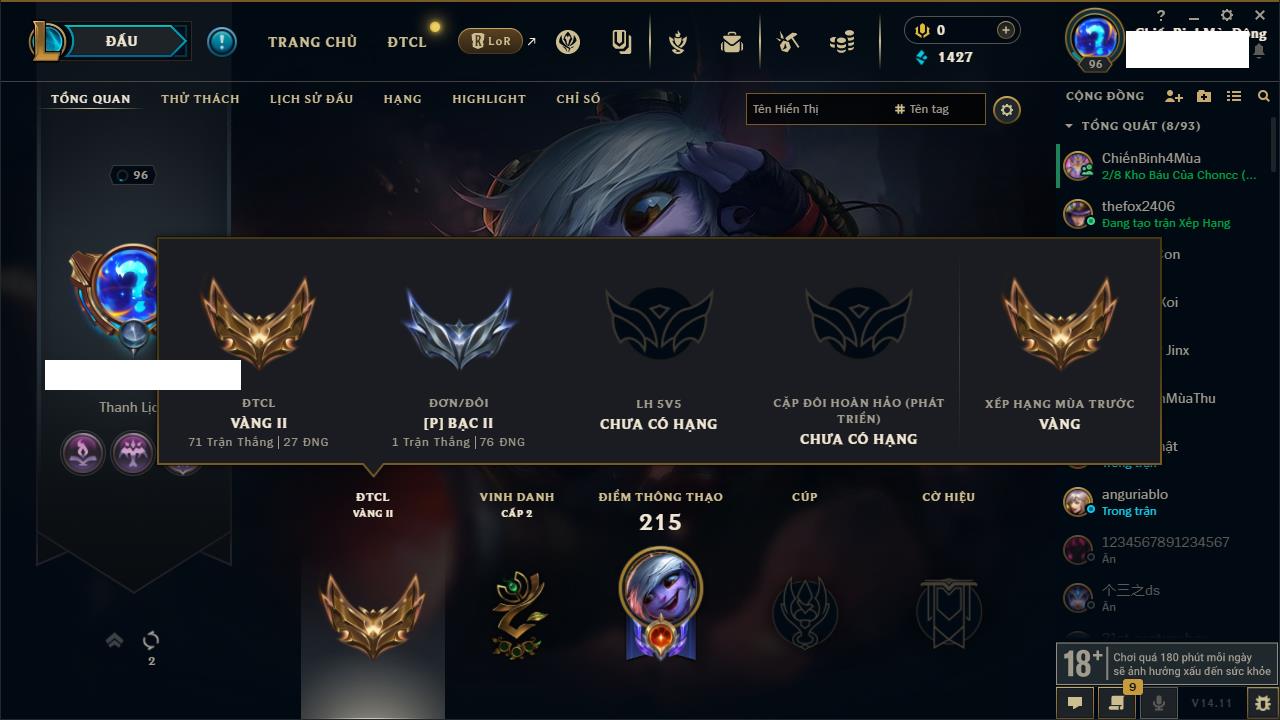 Rank Đơn: Bạc IIKhung: VàngTướng: 171 - Còn 332462 THXTrang Phục: 165Rank ĐTCL: Kim Cương IVLinh Thú: 181
