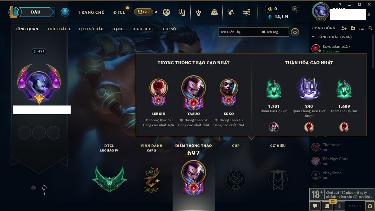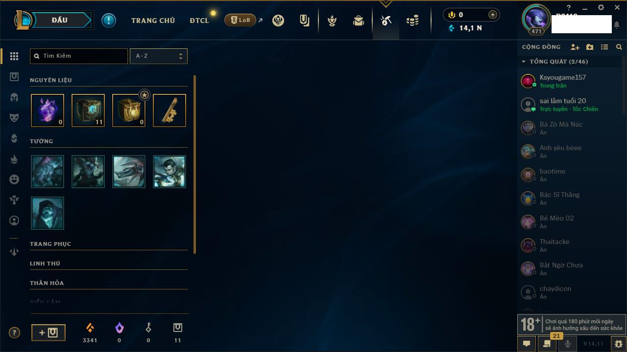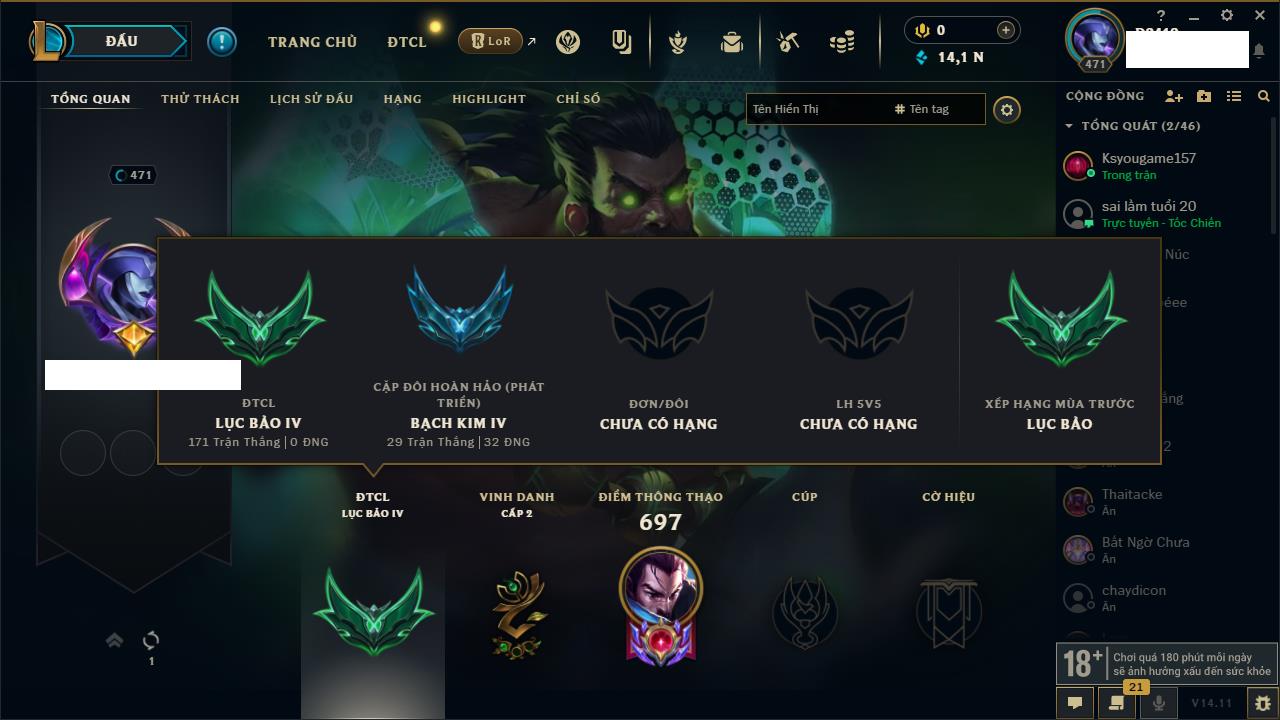 Rank Đơn: Vàng IKhung: BạcTướng: 171 - Còn 60584 THXTrang Phục: 286Rank ĐTCL: Vàng IIILinh Thú: 117