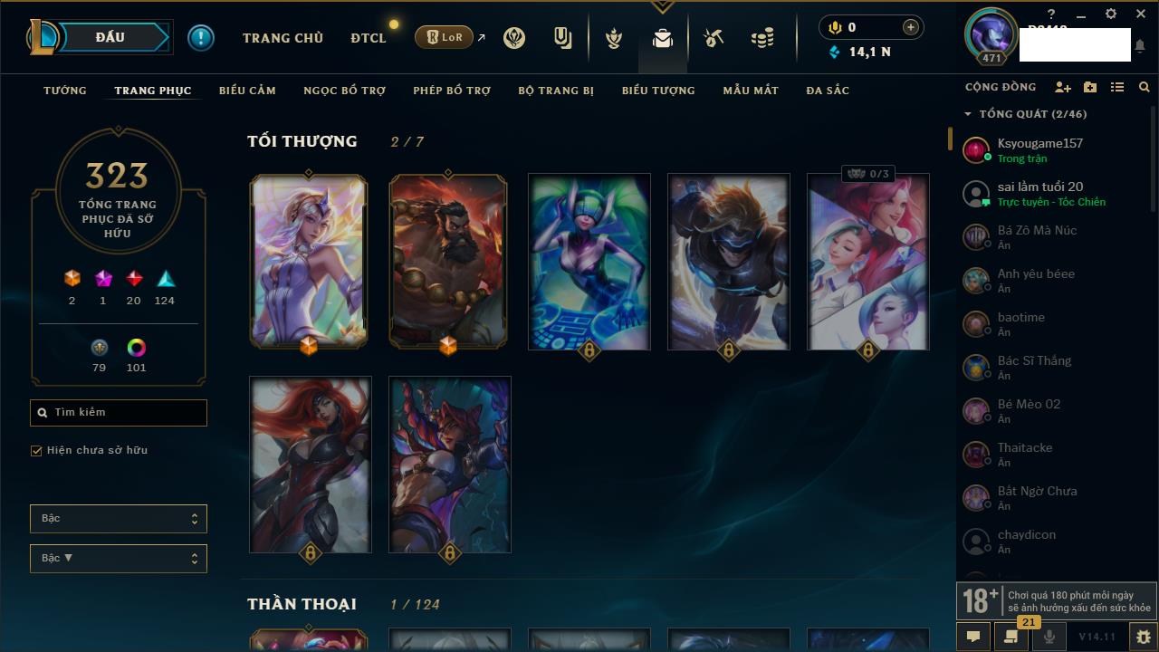 Rank Đơn: Vàng IIIKhung: VàngTướng: 171 - Còn 88128 THXTrang Phục: 329Rank ĐTCL: Chưa RankLinh Thú: 41