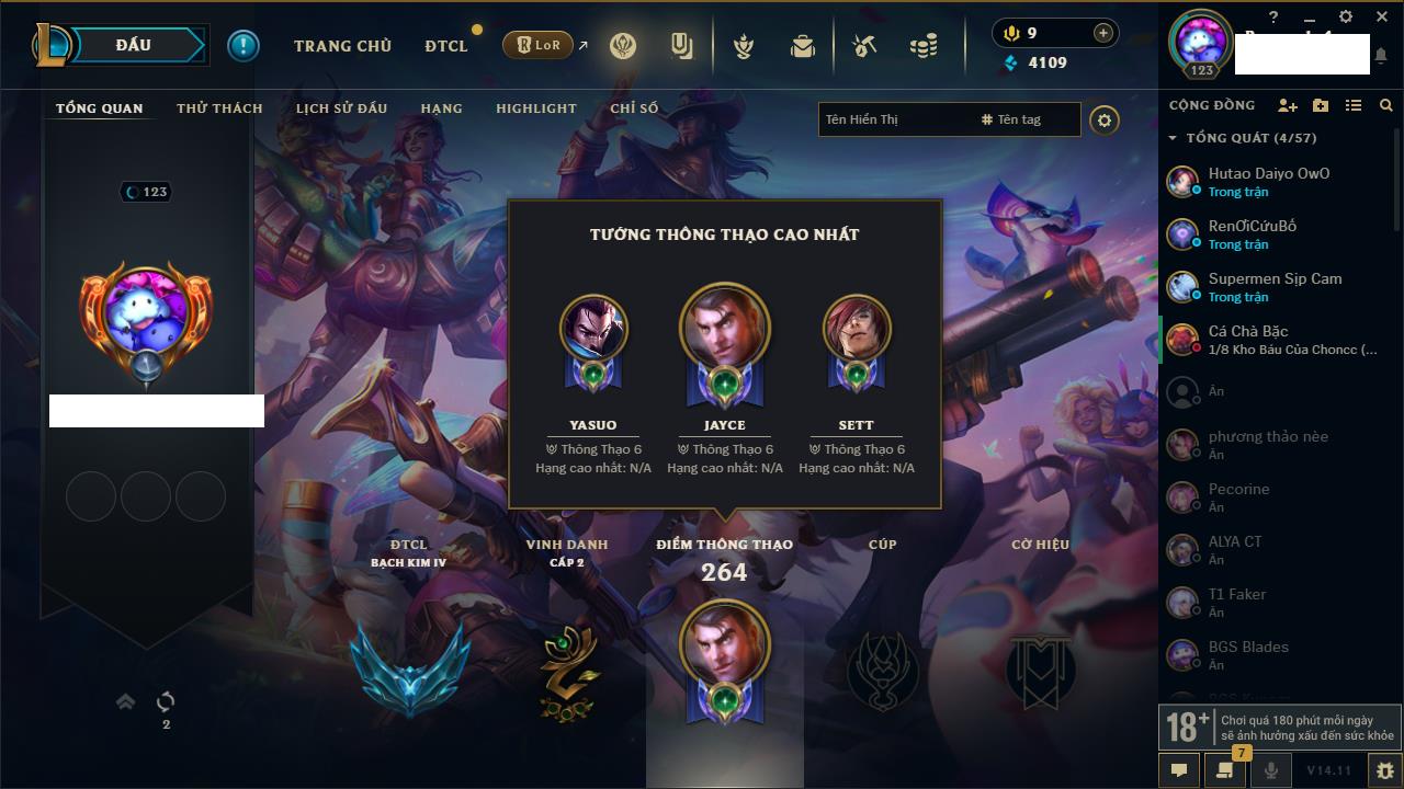 Rank Đơn: Chưa Rank Khung: Vàng Tướng: 171 - Còn 140250 THX Trang Phục: 80 Rank ĐTCL: Chưa Rank Linh Thú: 68