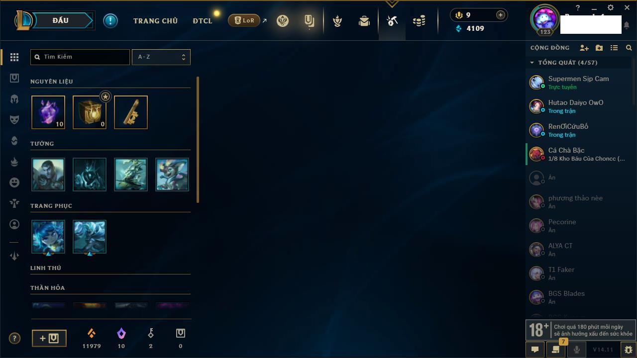 Rank Đơn: Chưa Rank Khung: Chưa có khung Tướng: 157 - Còn 51905 THX Trang Phục: 3 Rank ĐTCL: Chưa Rank Linh Thú: 175