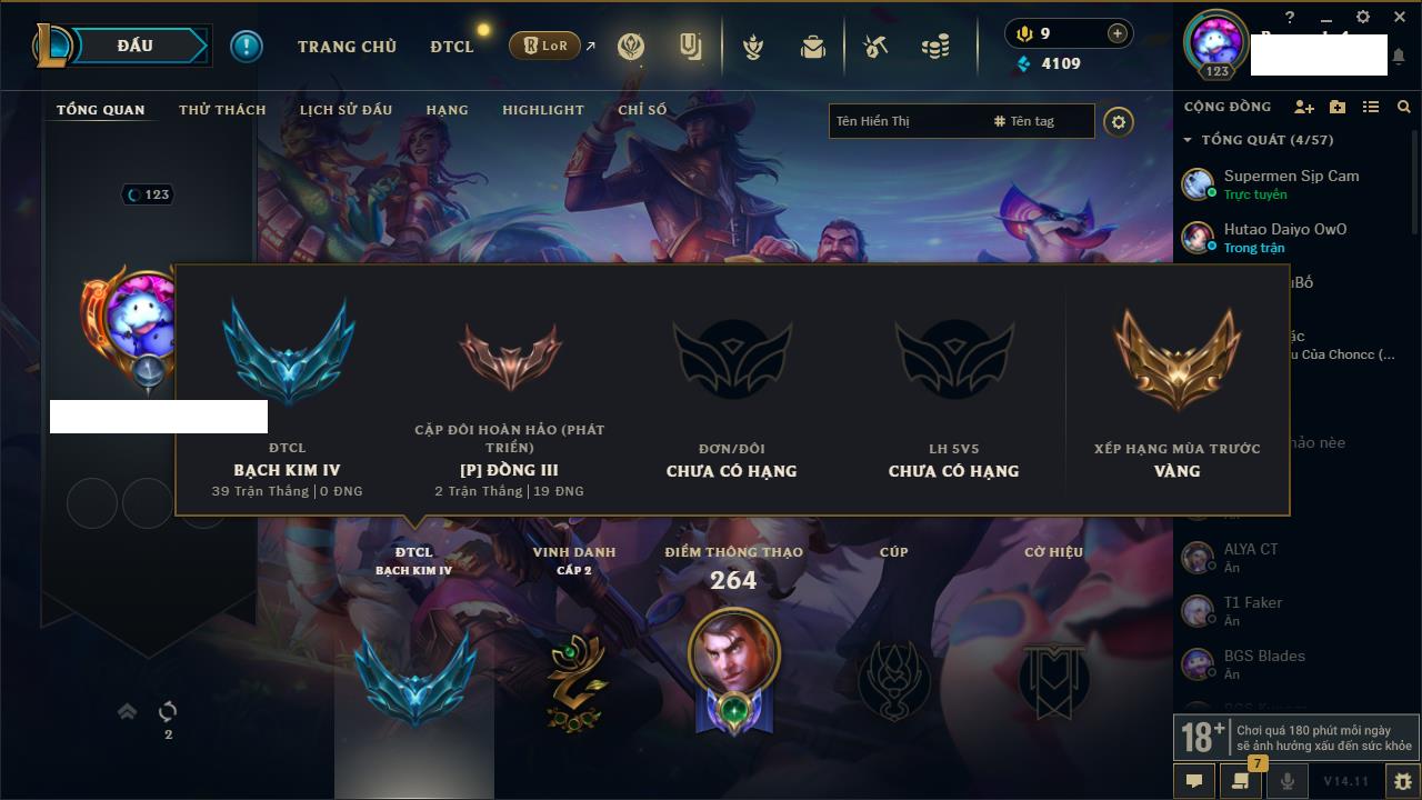 Rank Đơn: Chưa Rank Khung: Bạc Tướng: 84 - Còn 11948 THX Trang Phục: 23 Rank ĐTCL: Chưa Rank Linh Thú: 63