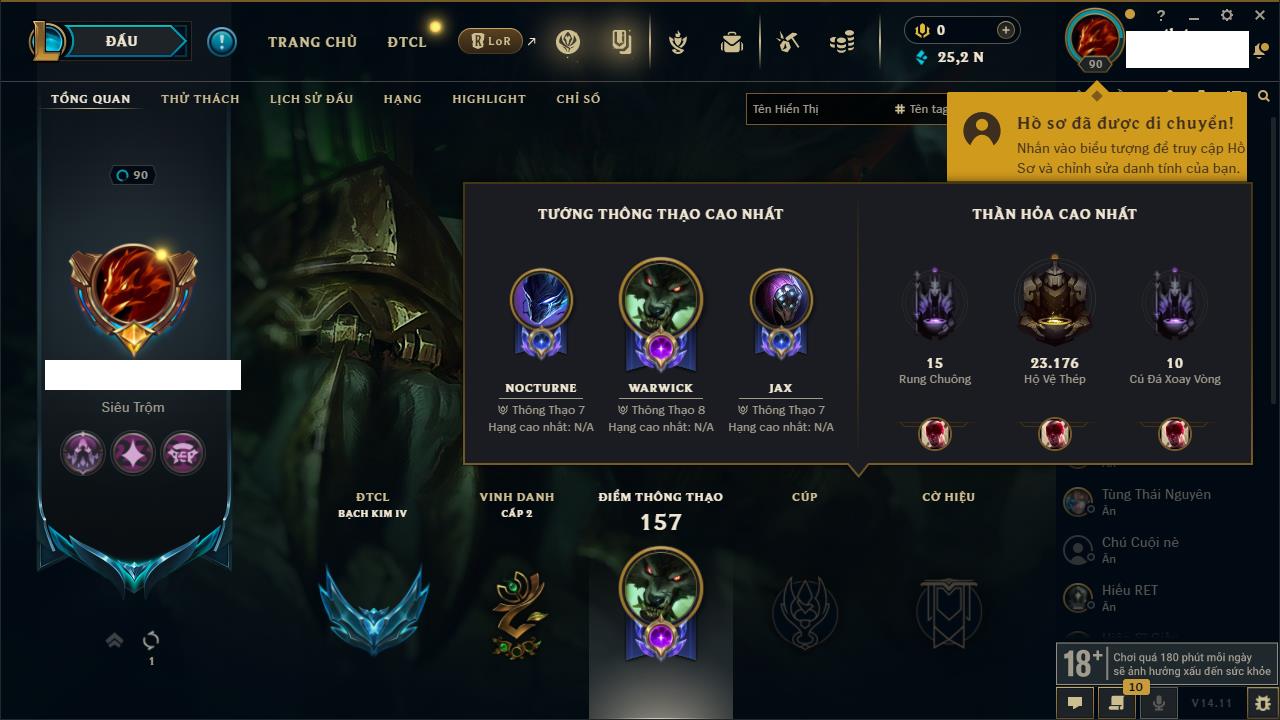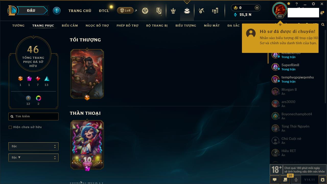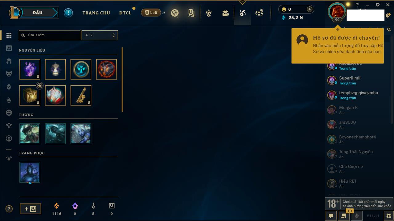 Rank Đơn: Đồng IIKhung: Chưa có khungTướng: 170 - Còn 56487 THXTrang Phục: 90Rank ĐTCL: Chưa RankLinh Thú: 129
