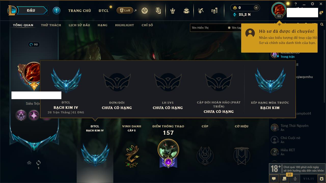 Rank Đơn: Đồng IIIKhung: ĐồngTướng: 171 - Còn 54778 THXTrang Phục: 96Rank ĐTCL: Bạch Kim IIILinh Thú: 140