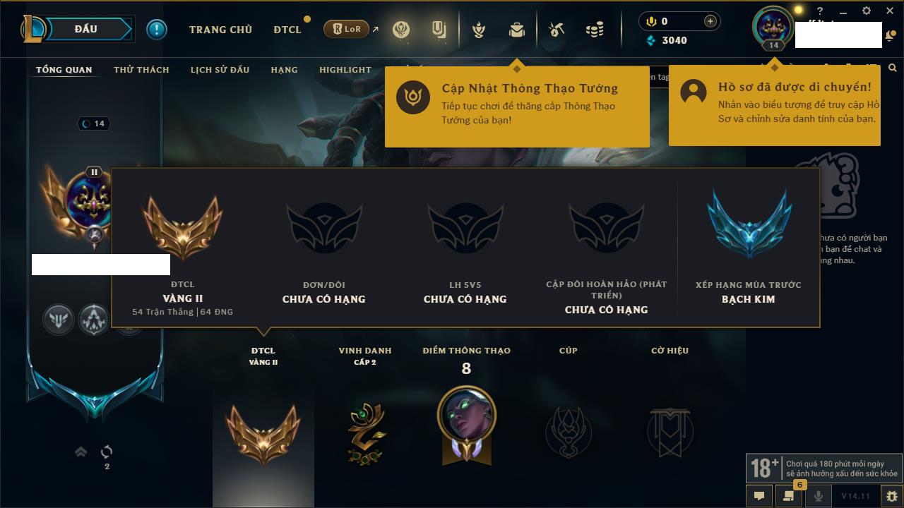 Rank Đơn: Bạc IV Khung: Bạc Tướng: 64 - Còn 5901 THX Trang Phục: 17 Rank ĐTCL: Chưa Rank Linh Thú: 105