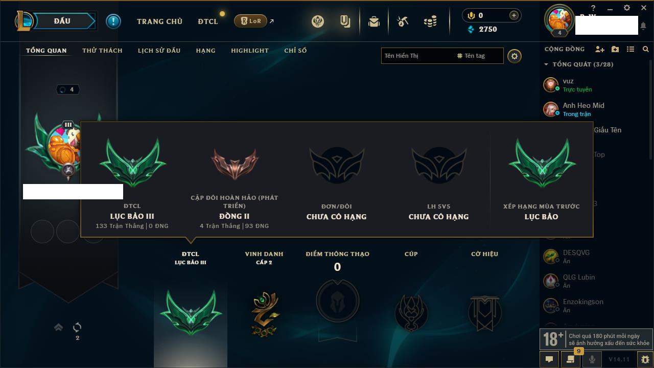 Rank Đơn: Vàng IIIKhung: VàngTướng: 77 - Còn 21172 THXTrang Phục: 8Rank ĐTCL: Kim Cương IIILinh Thú: 23