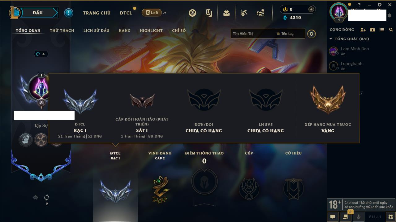 Rank Đơn: Chưa rank mùa nàoKhung: Chưa có khungTướng: 28 - Còn 5900 THXTrang Phục: 0Rank ĐTCL: Chưa RankLinh Thú: 2