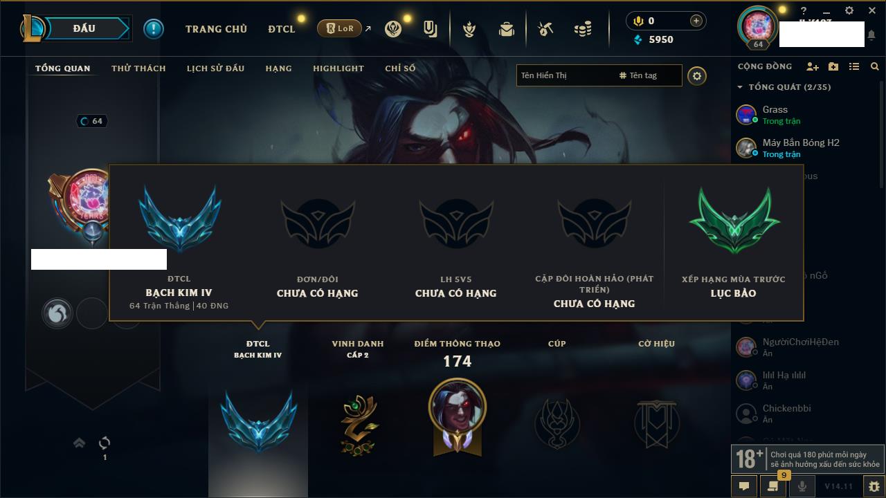 Rank Đơn: Bạc IV Khung: Bạc Tướng: 64 - Còn 5901 THX Trang Phục: 17 Rank ĐTCL: Chưa Rank Linh Thú: 105