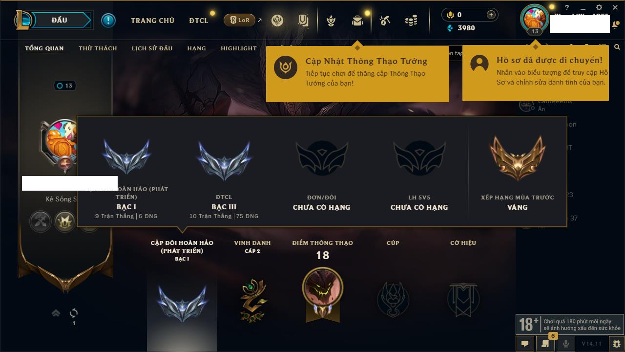 Rank Đơn: Chưa rank mùa nàoKhung: Chưa có khungTướng: 23 - Còn 3775 THXTrang Phục: 0Rank ĐTCL: Chưa RankLinh Thú: 4