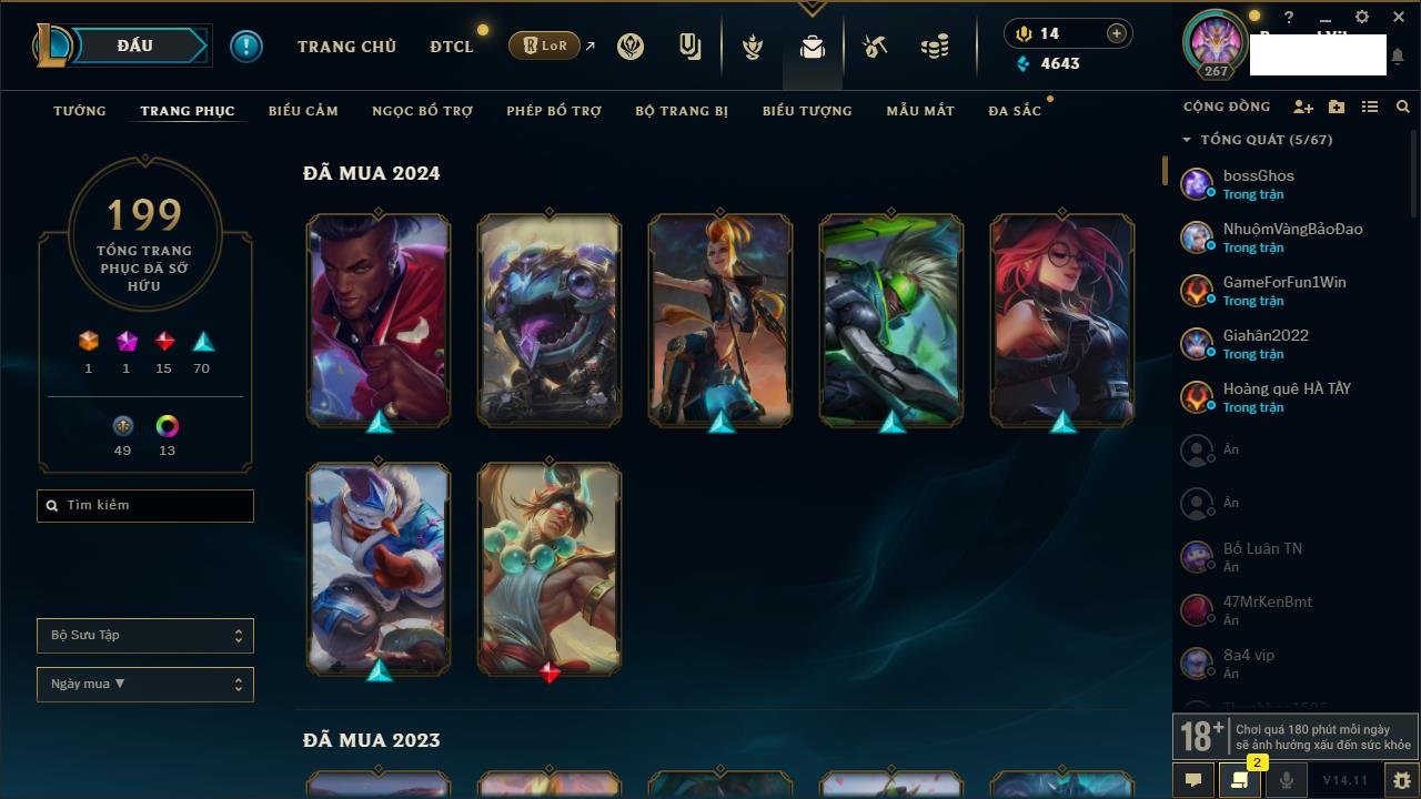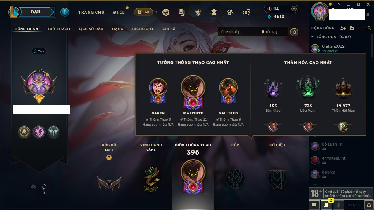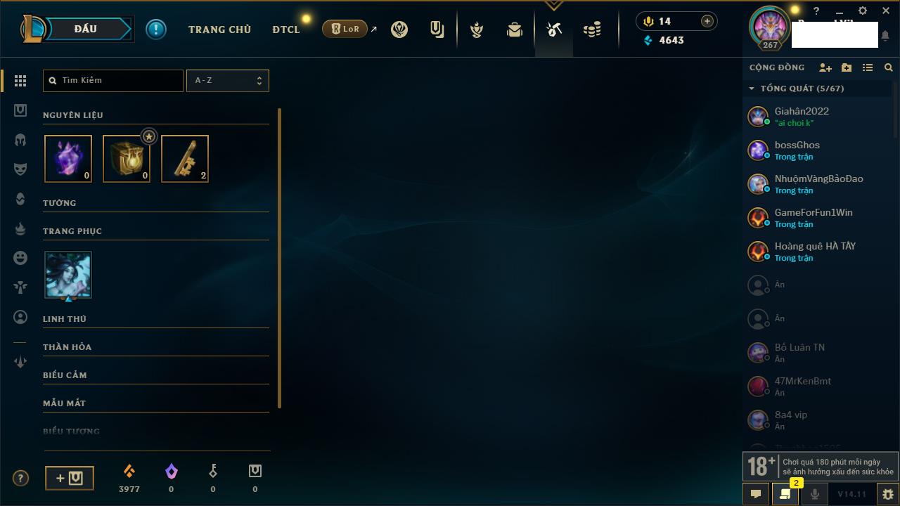 Rank Đơn: Vàng IVKhung: BạcTướng: 166 - Còn 180925 THXTrang Phục: 163Rank ĐTCL: Chưa RankLinh Thú: 67