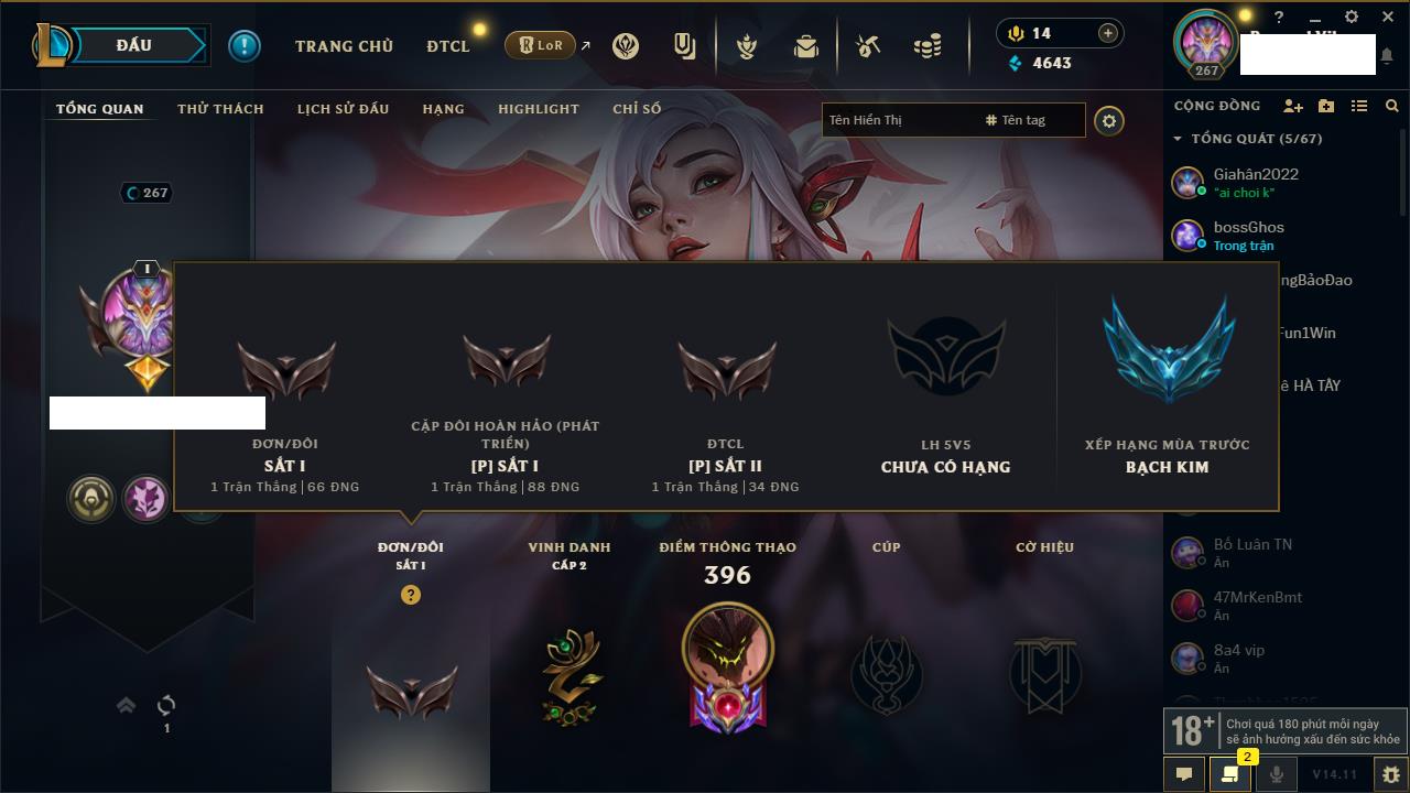 Rank Đơn: Bạc IIKhung: VàngTướng: 171 - Còn 332462 THXTrang Phục: 165Rank ĐTCL: Kim Cương IVLinh Thú: 181