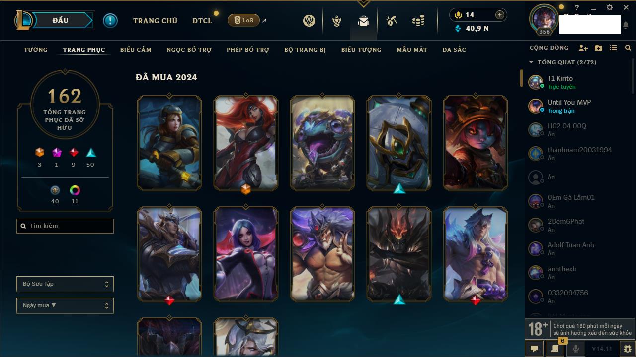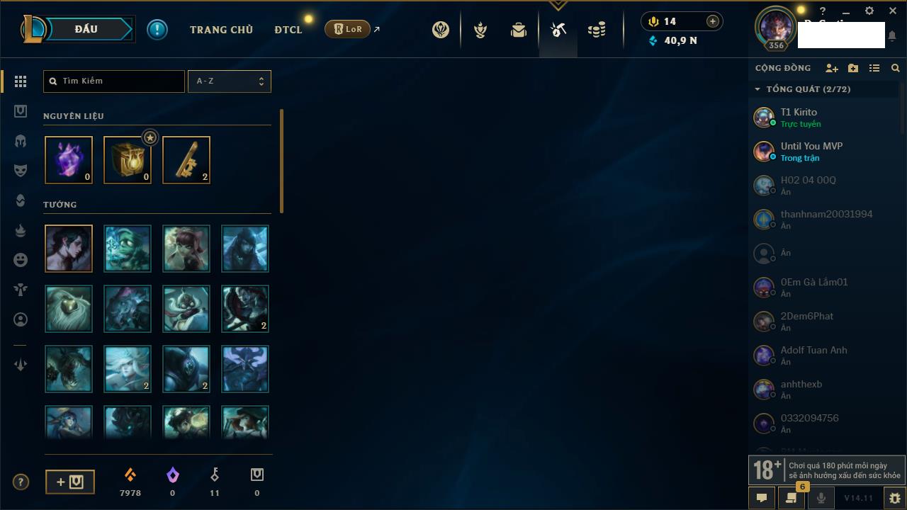 Rank Đơn: Bạc IVKhung: BạcTướng: 171 - Còn 102637 THXTrang Phục: 169Rank ĐTCL: Vàng IILinh Thú: 127