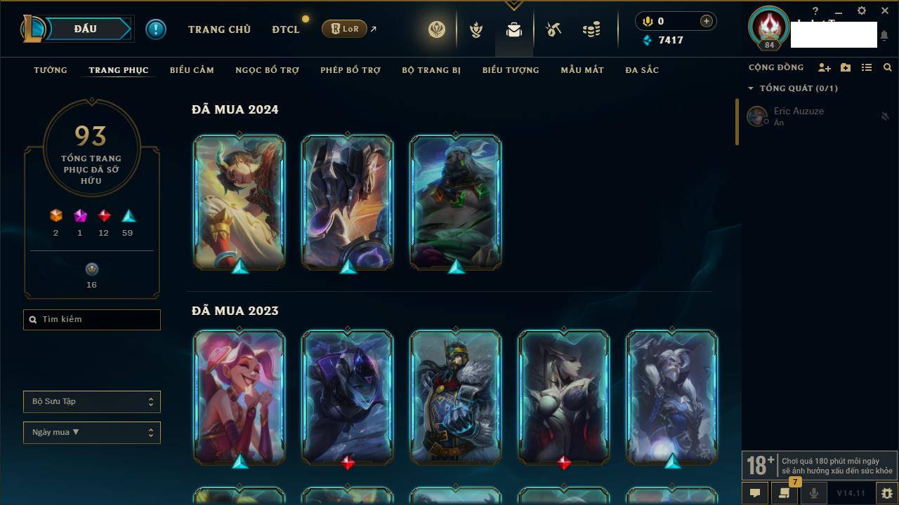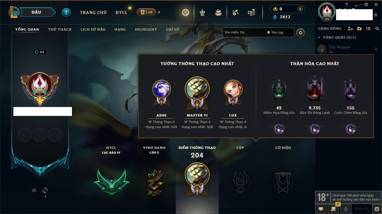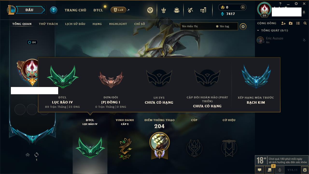 Rank Đơn: Chưa RankKhung: Chưa có khungTướng: 154 - Còn 18477 THXTrang Phục: 127Rank ĐTCL: Vàng ILinh Thú: 183