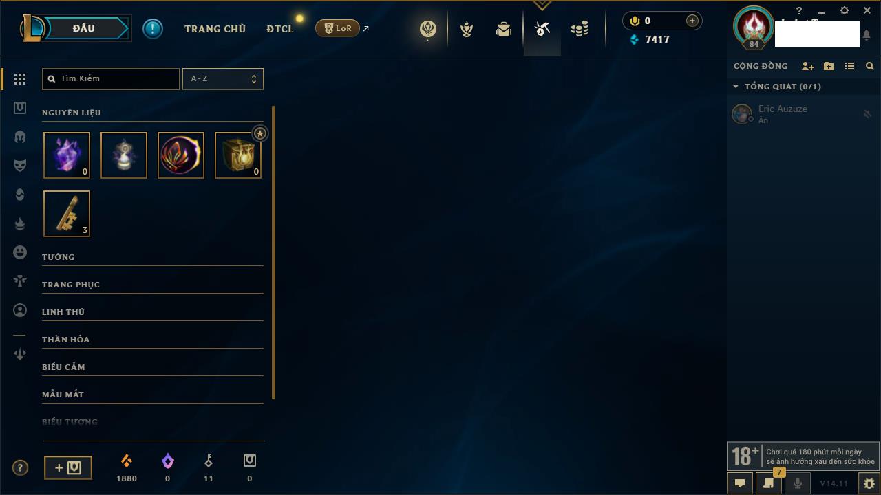 Rank Đơn: Chưa rank mùa nàoKhung: Chưa có khungTướng: 0 - Còn 2000 THXTrang Phục: 0Rank ĐTCL: Chưa RankLinh Thú: 14