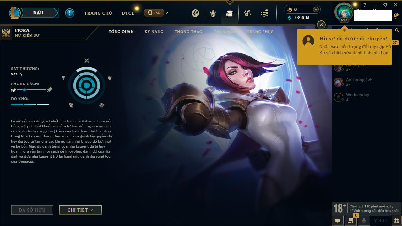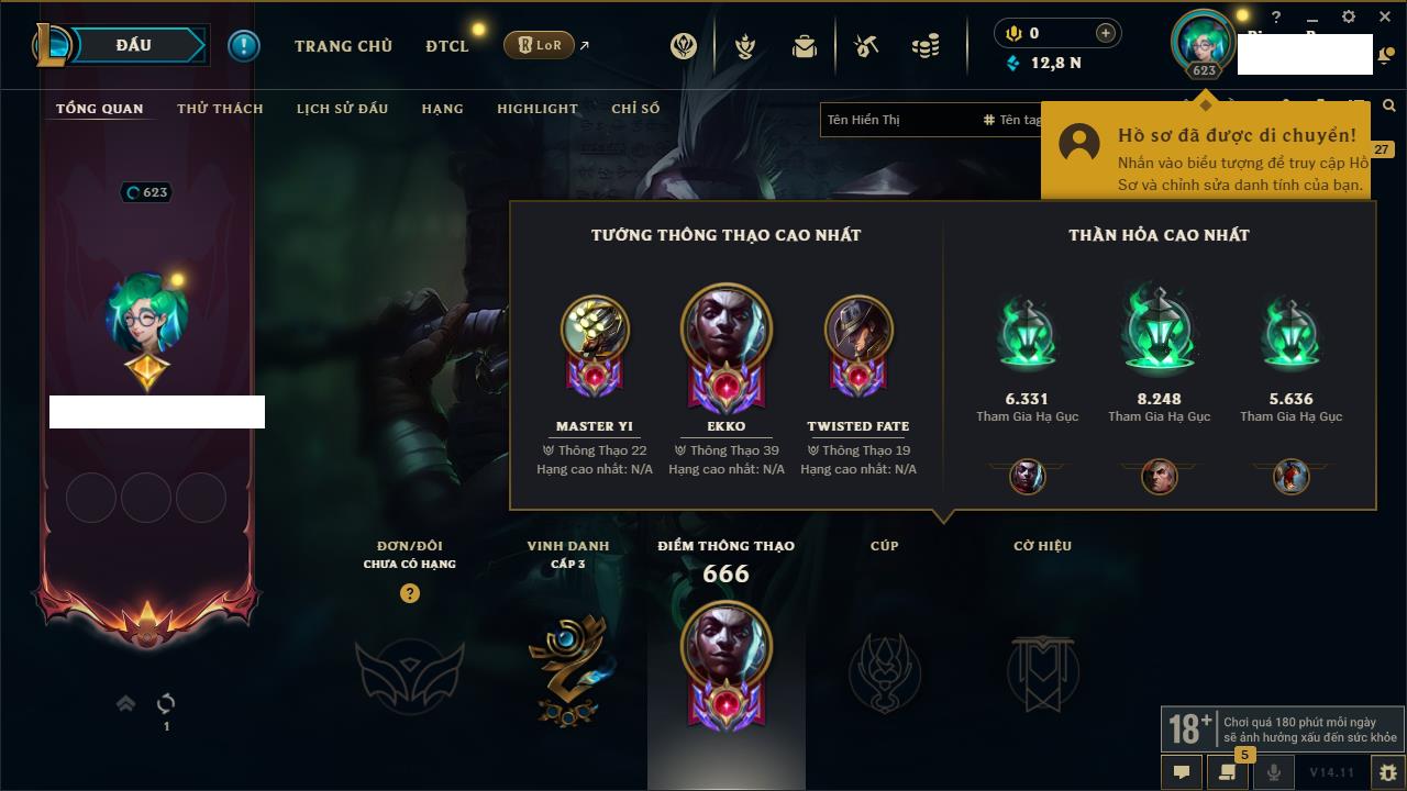 Rank Đơn: Vàng IIKhung: VàngTướng: 171 - Còn 219803 THXTrang Phục: 254Rank ĐTCL: Chưa RankLinh Thú: 78