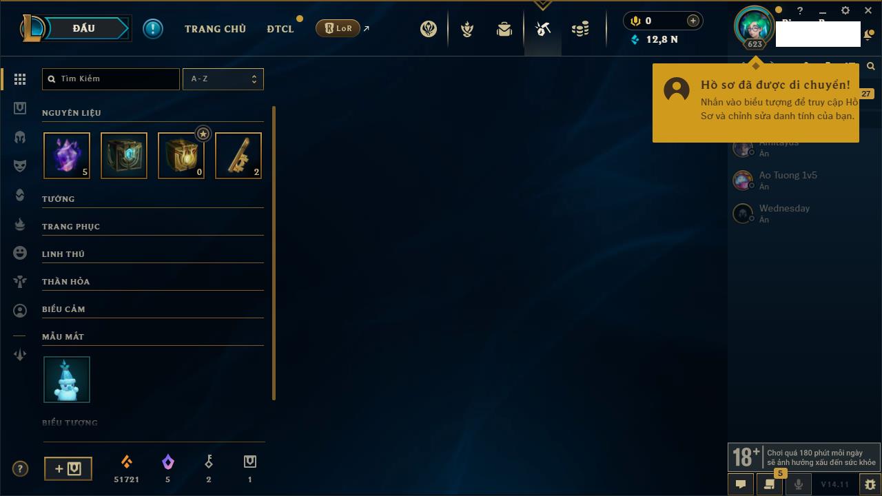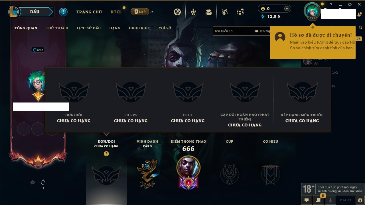 Rank Đơn: Bạch Kim IVKhung: VàngTướng: 171 - Còn 130280 THXTrang Phục: 226Rank ĐTCL: Kim Cương IVLinh Thú: 183