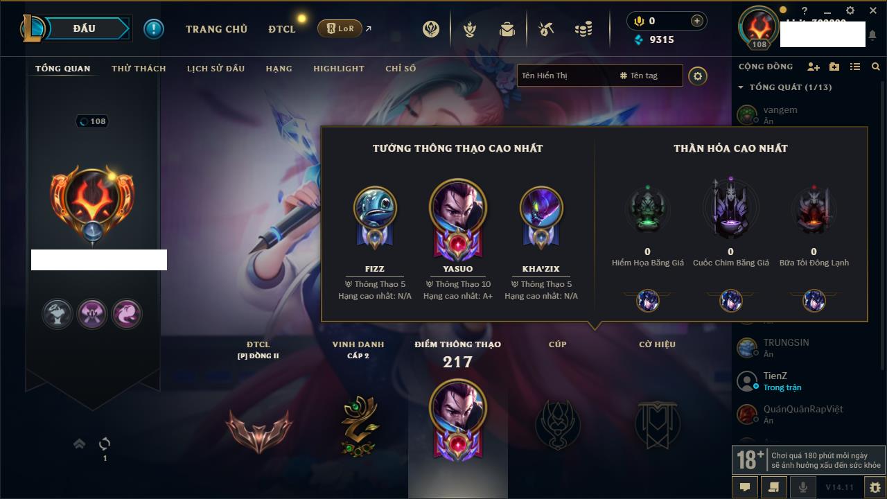 Rank Đơn: Chưa RankKhung: Chưa có khungTướng: 157 - Còn 6783 THXTrang Phục: 50Rank ĐTCL: Chưa RankLinh Thú: 37