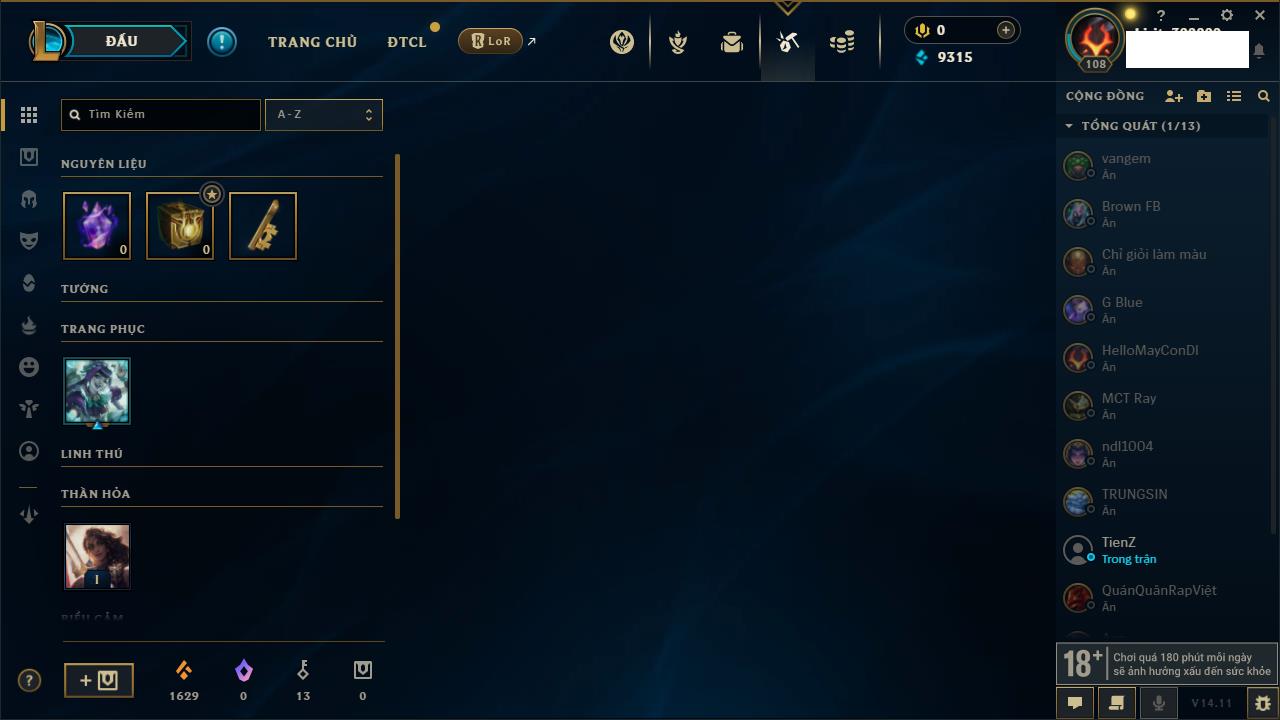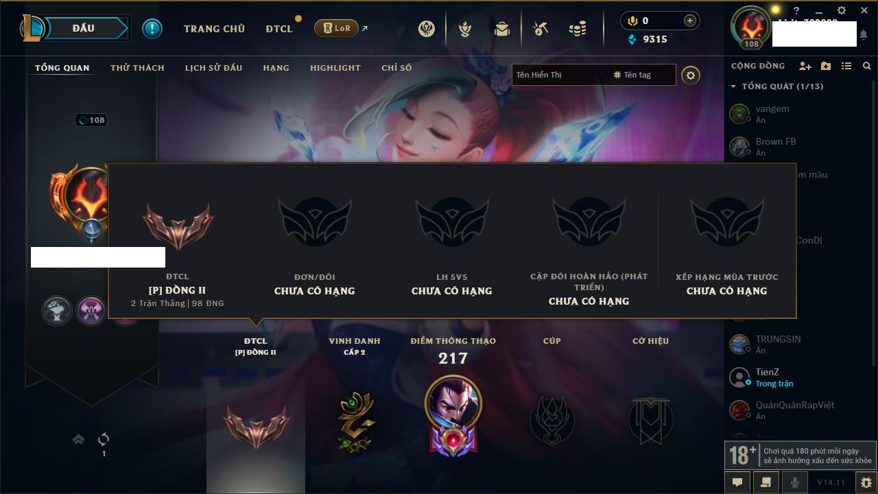 Rank Đơn: Đồng IIKhung: Chưa có khungTướng: 170 - Còn 56487 THXTrang Phục: 90Rank ĐTCL: Chưa RankLinh Thú: 129
