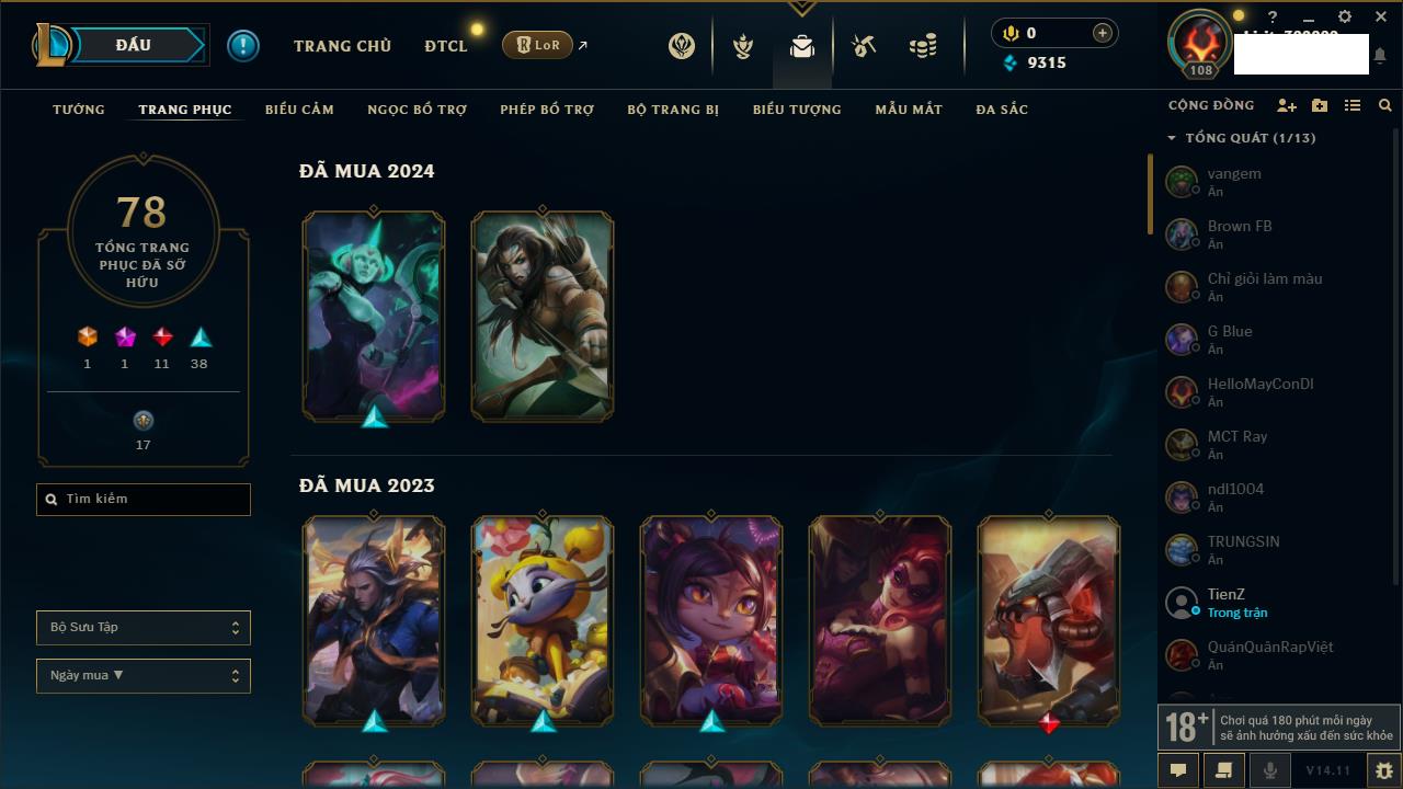 Rank Đơn: Vàng IIIKhung: VàngTướng: 170 - Còn 33222 THXTrang Phục: 136Rank ĐTCL: Chưa RankLinh Thú: 40