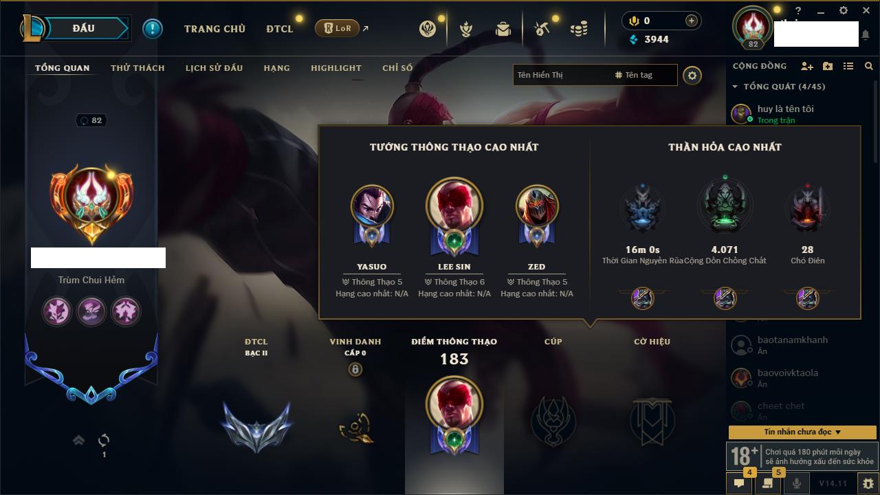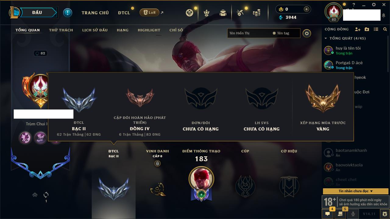 Rank Đơn: Chưa RankKhung: Chưa có khungTướng: 118 - Còn 13712 THXTrang Phục: 117Rank ĐTCL: Chưa RankLinh Thú: 34