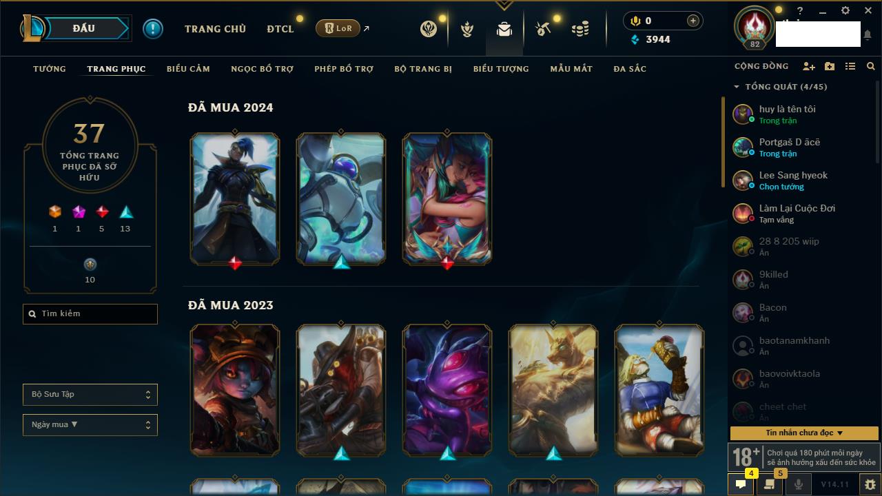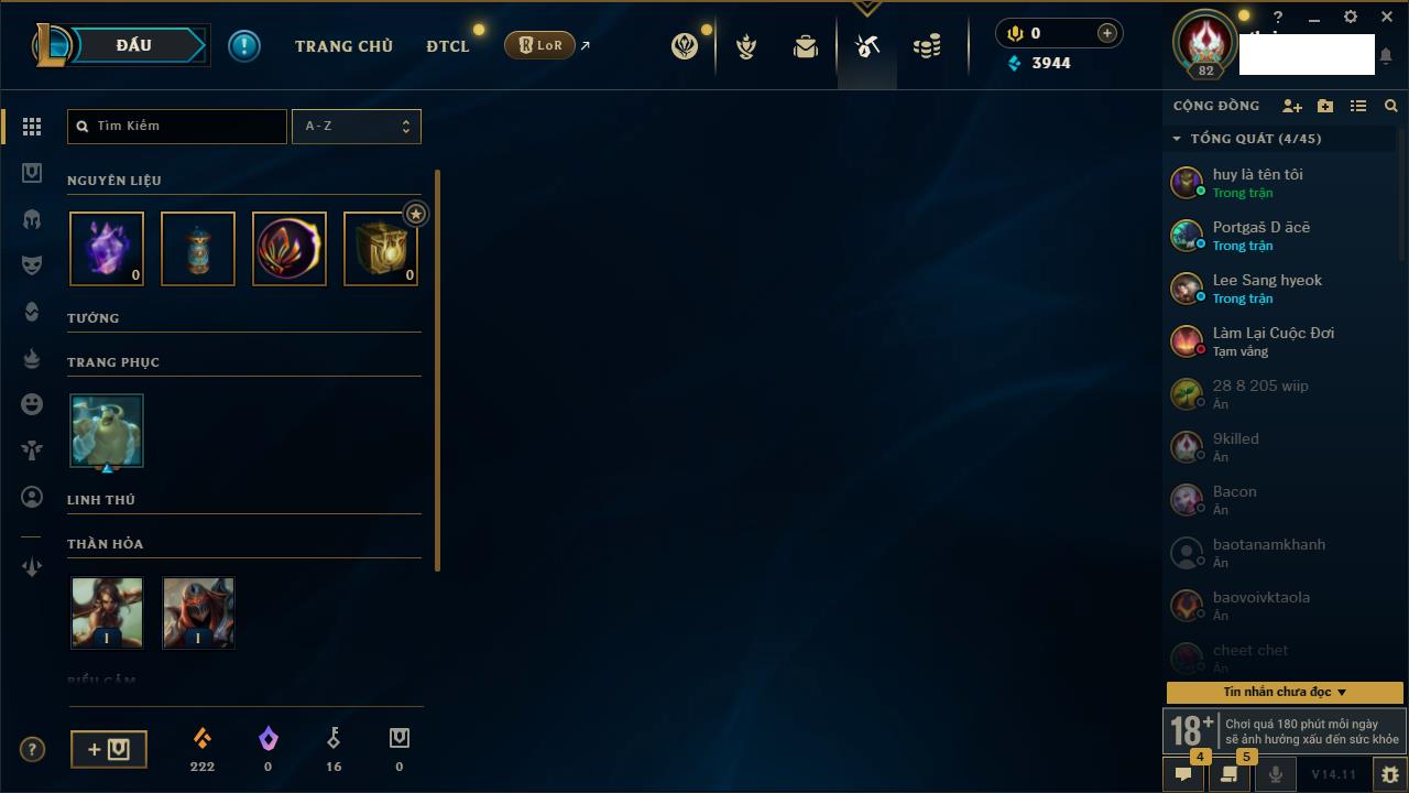 Rank Đơn: Chưa RankKhung: Chưa có khungTướng: 165 - Còn 3214 THXTrang Phục: 160Rank ĐTCL: Chưa RankLinh Thú: 28
