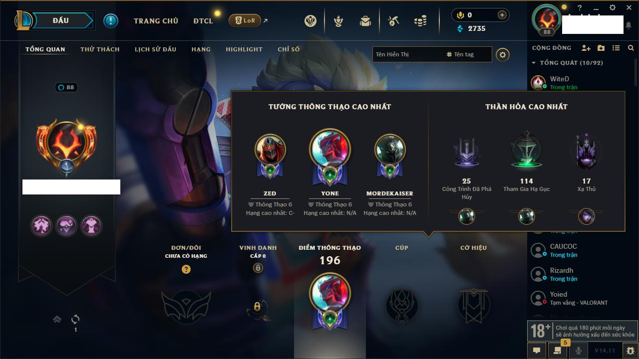 Rank Đơn: Chưa RankKhung: Chưa có khungTướng: 118 - Còn 13712 THXTrang Phục: 117Rank ĐTCL: Chưa RankLinh Thú: 34