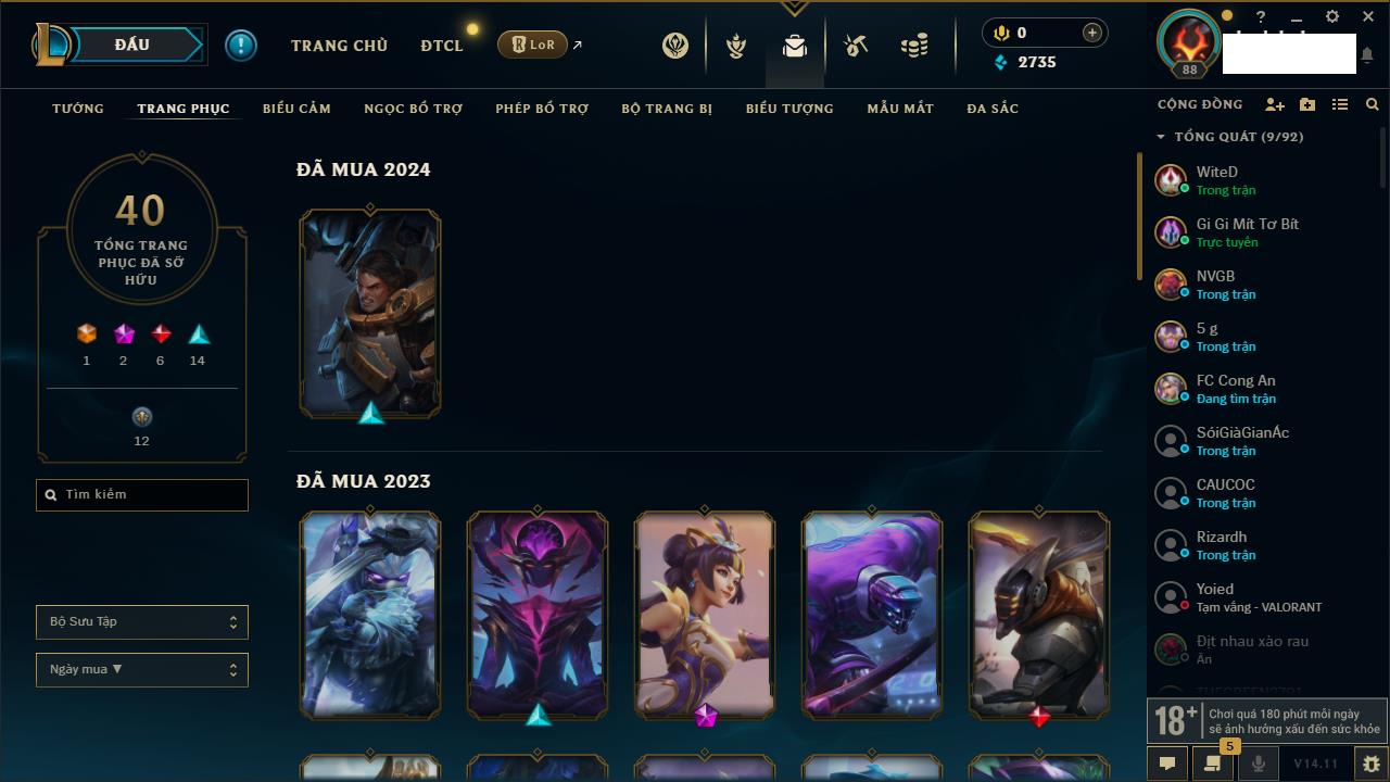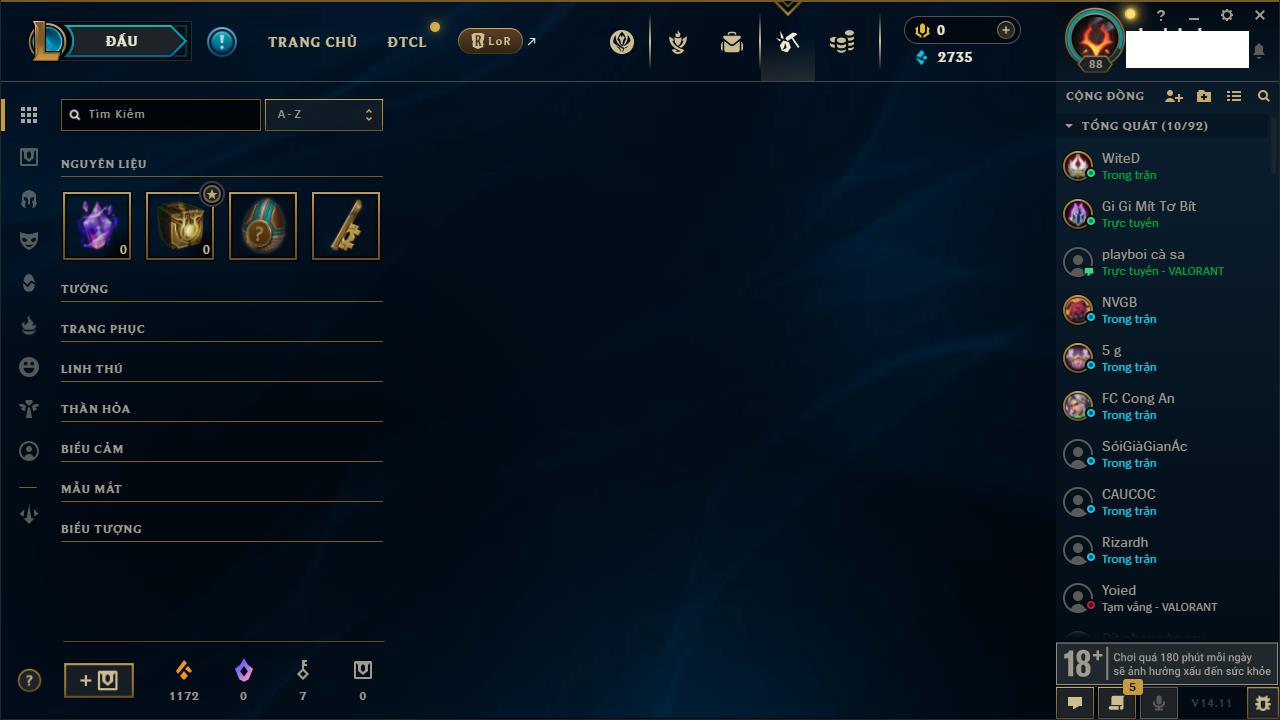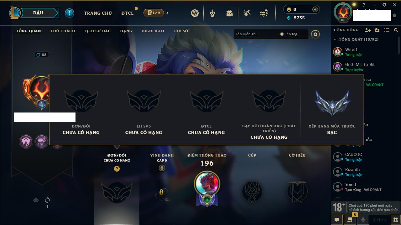 Rank Đơn: Chưa RankKhung: Chưa có khungTướng: 165 - Còn 3214 THXTrang Phục: 160Rank ĐTCL: Chưa RankLinh Thú: 28