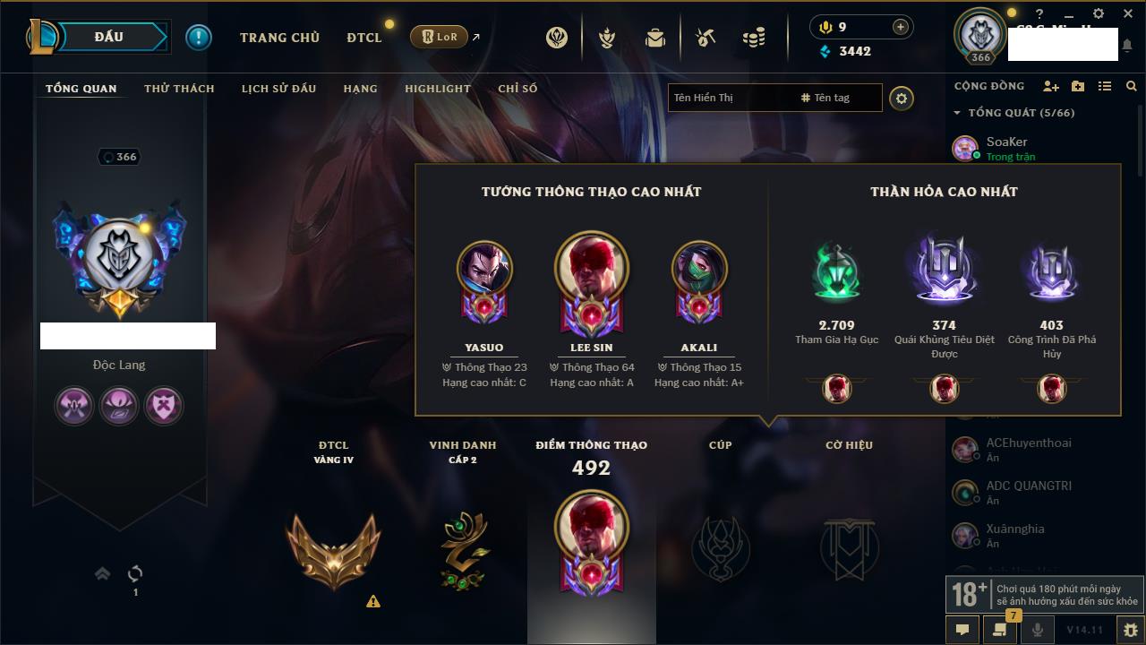 Rank Đơn: Vàng IVKhung: BạcTướng: 166 - Còn 180925 THXTrang Phục: 163Rank ĐTCL: Chưa RankLinh Thú: 67