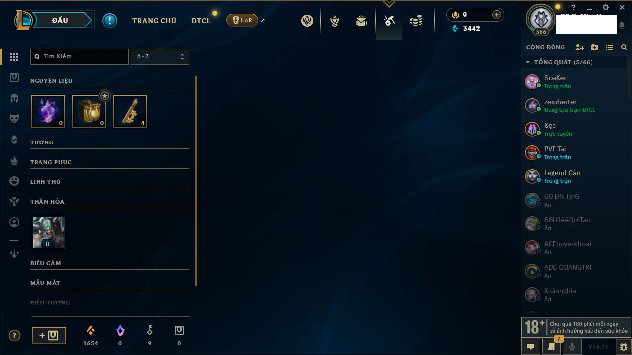 Rank Đơn: Vàng IVKhung: BạcTướng: 171 - Còn 426239 THXTrang Phục: 162Rank ĐTCL: Chưa RankLinh Thú: 33
