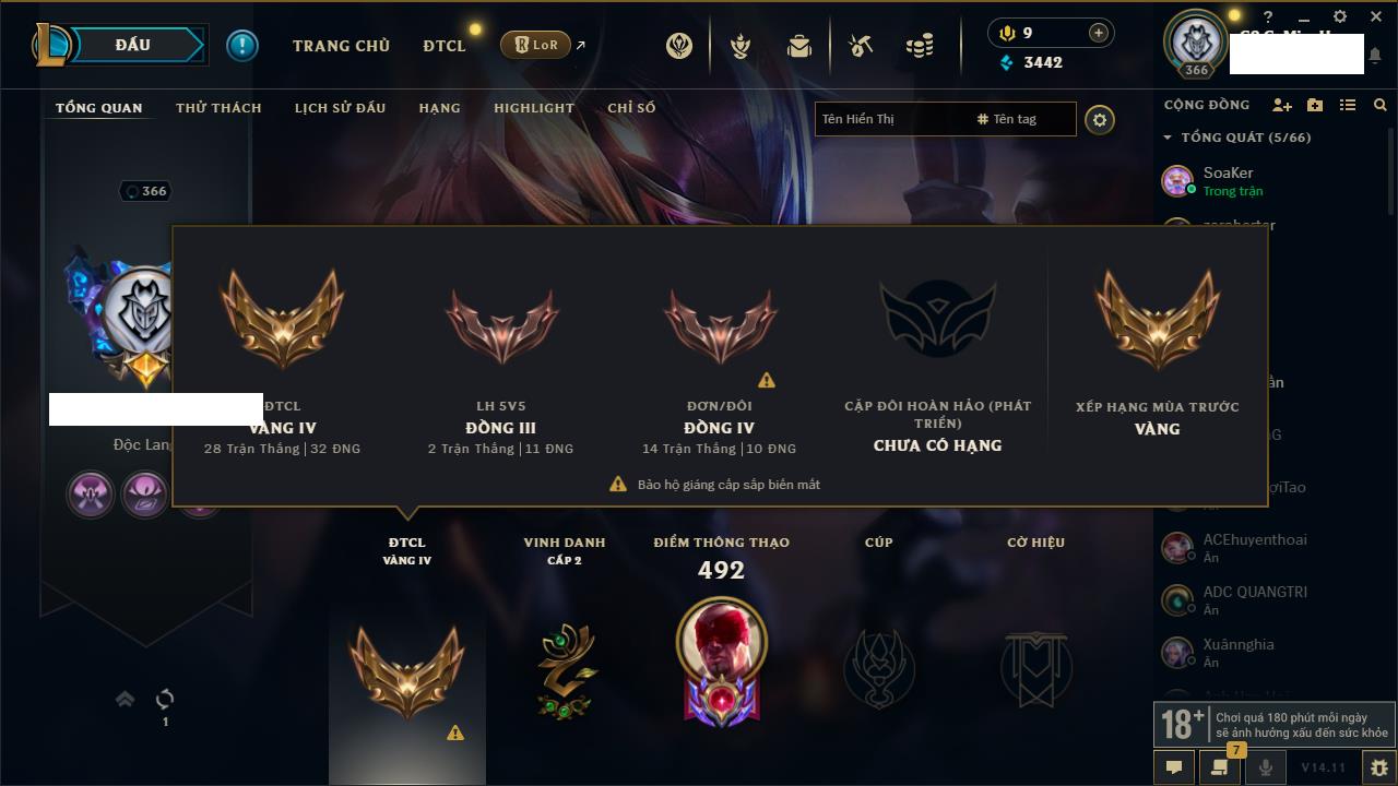 Rank Đơn: Bạc IIKhung: VàngTướng: 171 - Còn 332462 THXTrang Phục: 165Rank ĐTCL: Kim Cương IVLinh Thú: 181