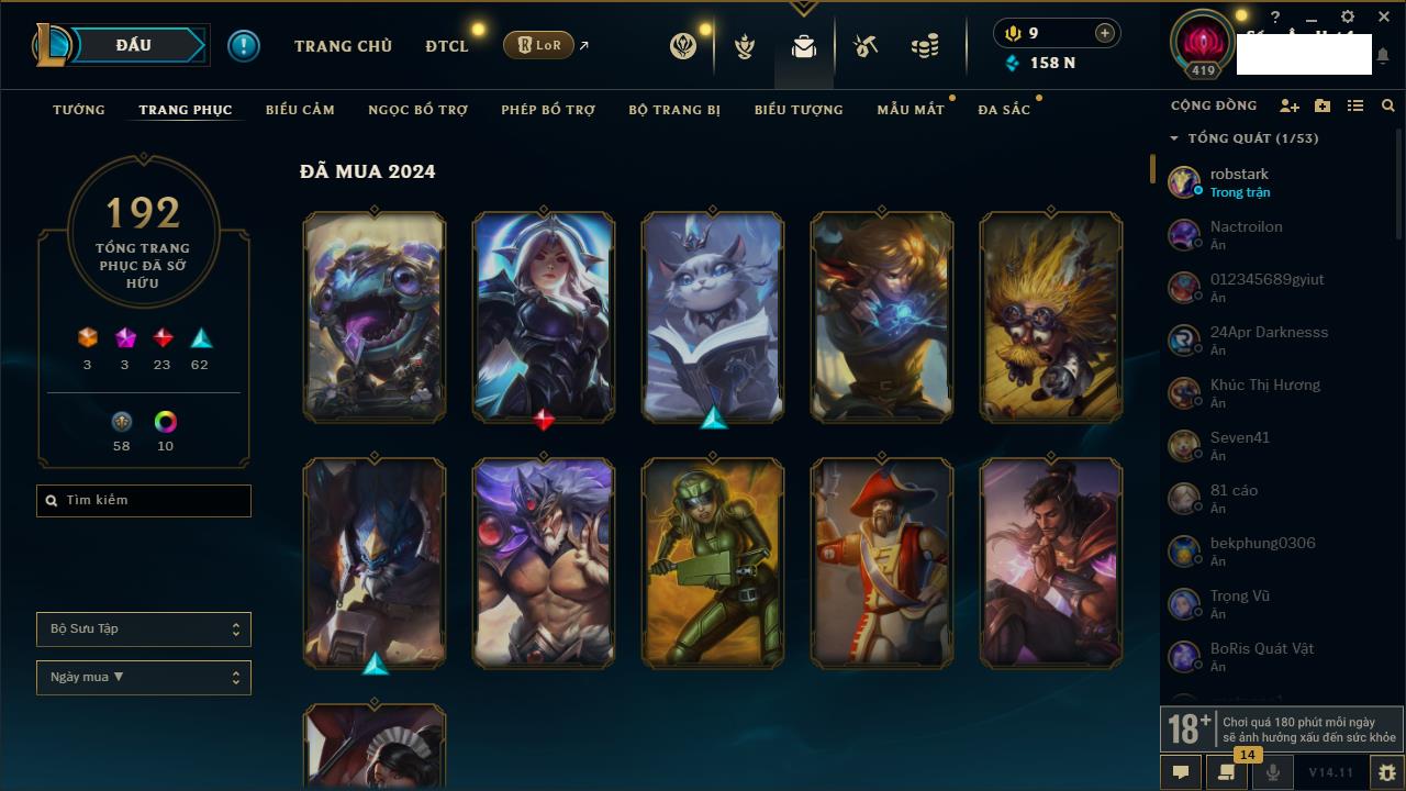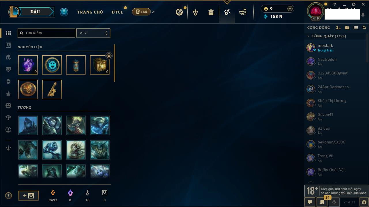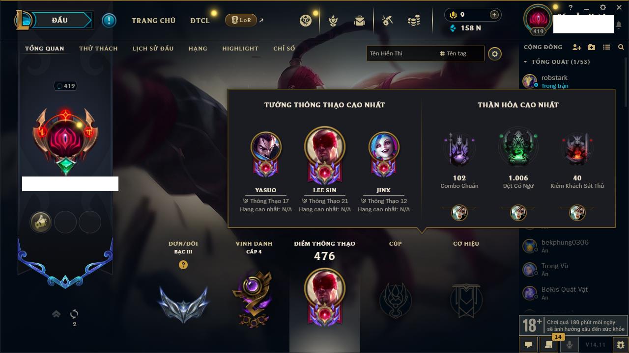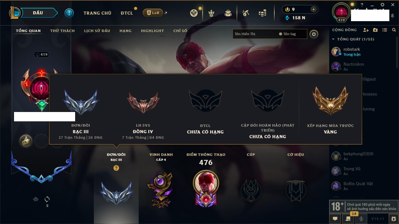 Rank Đơn: Vàng IIIKhung: BạcTướng: 171 - Còn 101359 THXTrang Phục: 88Rank ĐTCL: Kim Cương IVLinh Thú: 200