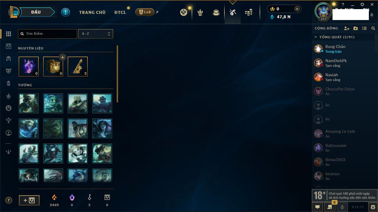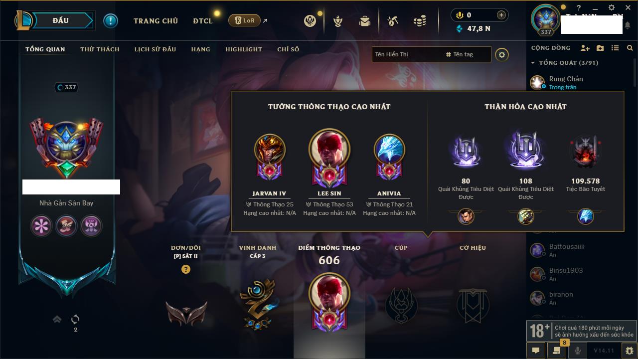 Rank Đơn: Bạc IIIKhung: Chưa có khungTướng: 171 - Còn 21493 THXTrang Phục: 252Rank ĐTCL: Bạch Kim IVLinh Thú: 123