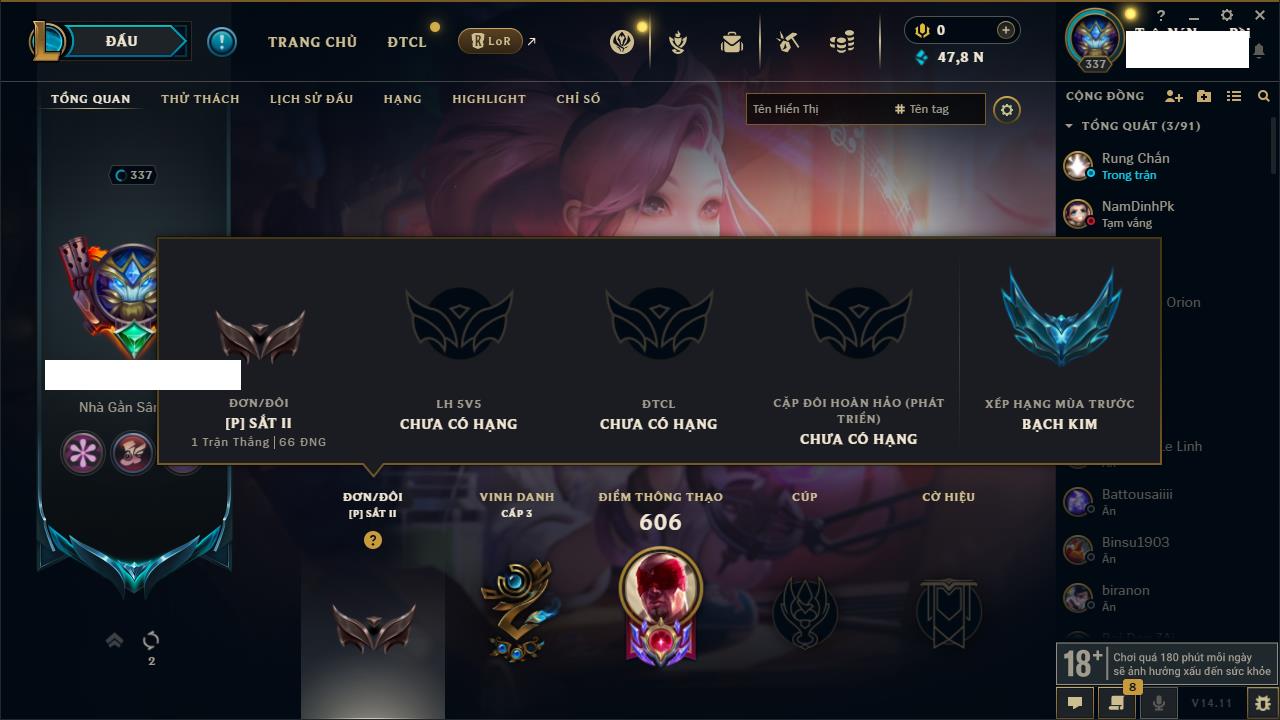 Rank Đơn: Bạch Kim IIIKhung: VàngTướng: 126 - Còn 23055 THXTrang Phục: 114Rank ĐTCL: Chưa RankLinh Thú: 21