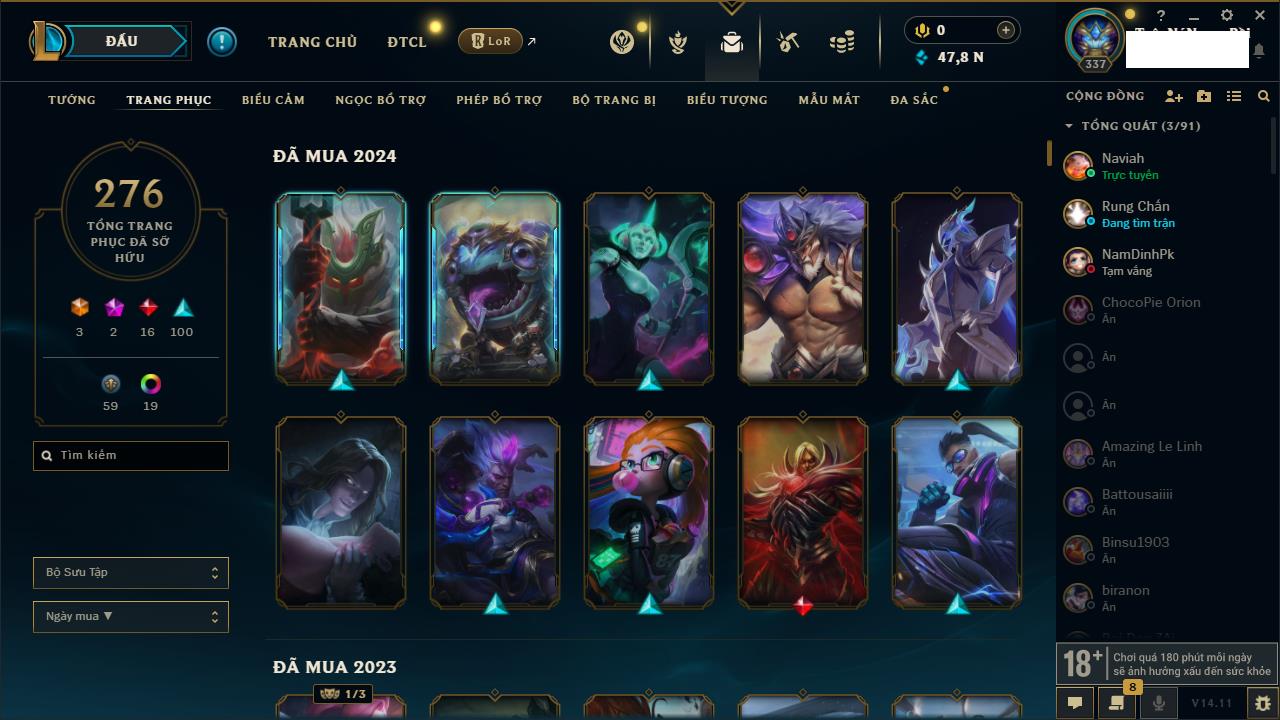 Rank Đơn: Vàng IIIKhung: VàngTướng: 161 - Còn 162202 THXTrang Phục: 179Rank ĐTCL: Chưa RankLinh Thú: 20