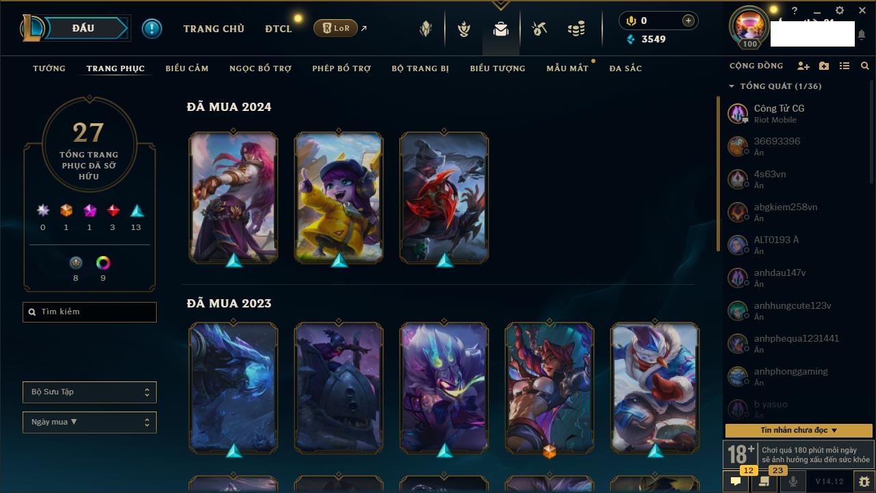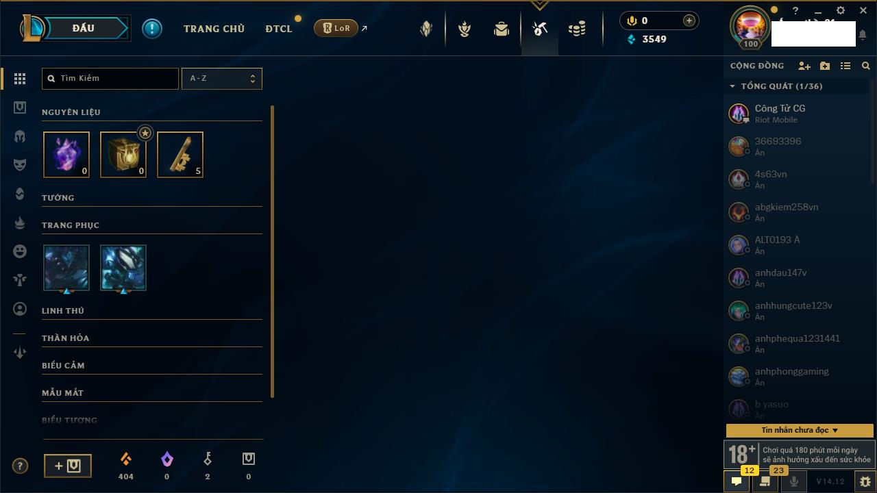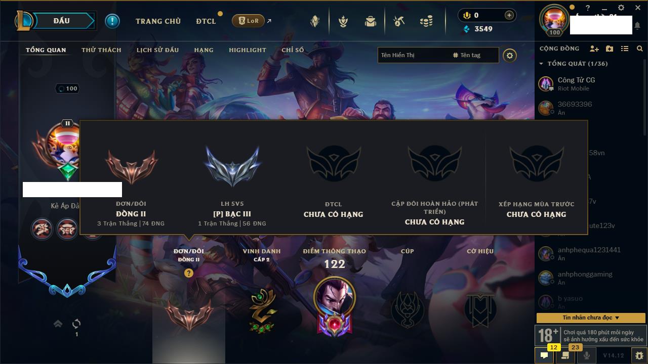 Rank Đơn: Chưa rank mùa nàoKhung: Chưa có khungTướng: 3 - Còn 34550 THXTrang Phục: 0Rank ĐTCL: Bạch Kim IVLinh Thú: 41