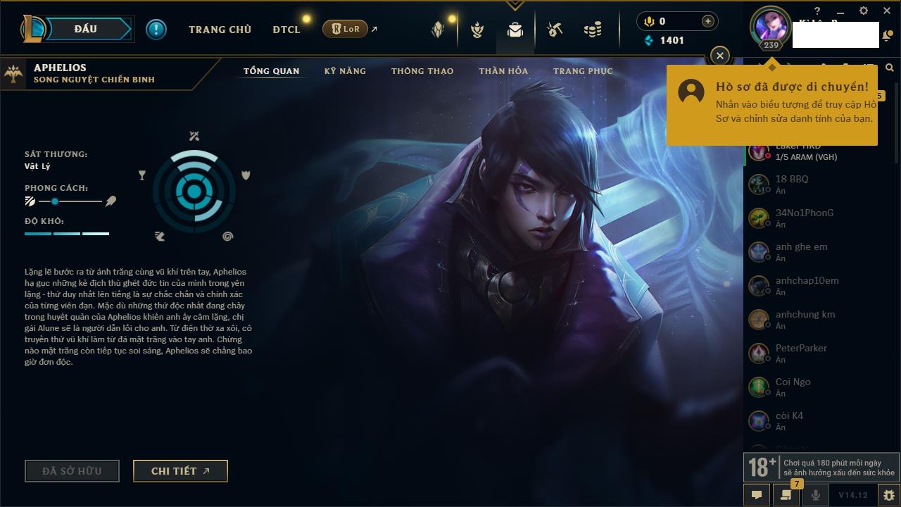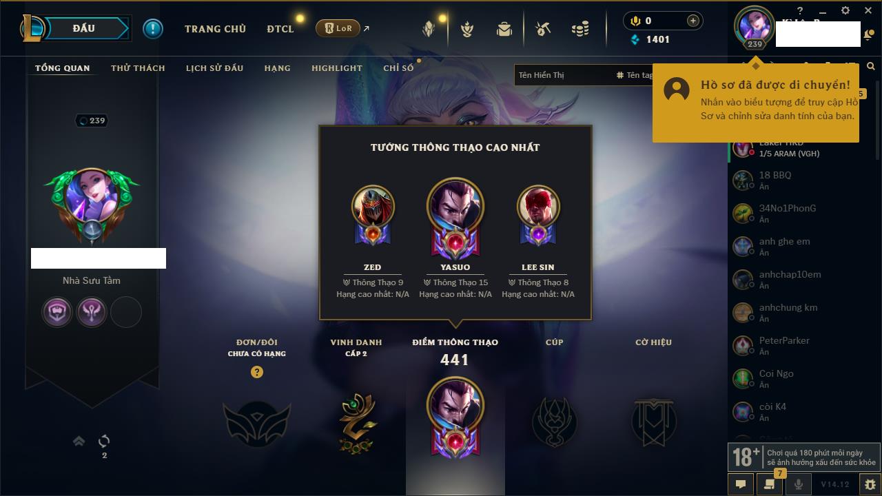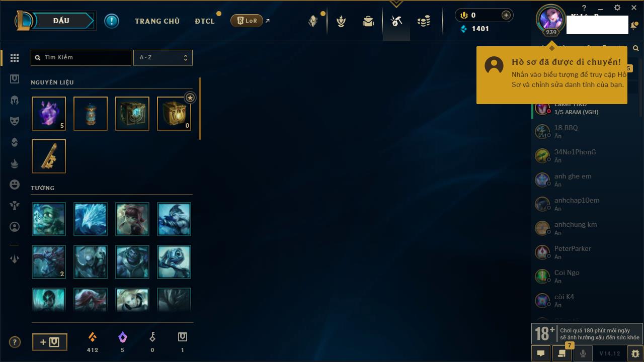 Rank Đơn: Vàng IIKhung: VàngTướng: 171 - Còn 219803 THXTrang Phục: 254Rank ĐTCL: Chưa RankLinh Thú: 78