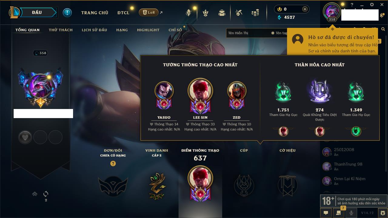 Rank Đơn: Sắt IVKhung: Chưa có khungTướng: 171 - Còn 9586 THXTrang Phục: 280Rank ĐTCL: Chưa RankLinh Thú: 114