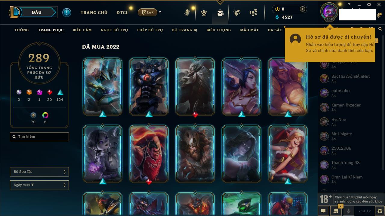 Rank Đơn: Vàng IIIKhung: Chưa có khungTướng: 171 - Còn 79750 THXTrang Phục: 288Rank ĐTCL: Chưa RankLinh Thú: 79
