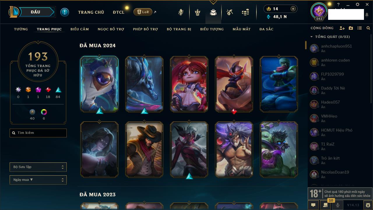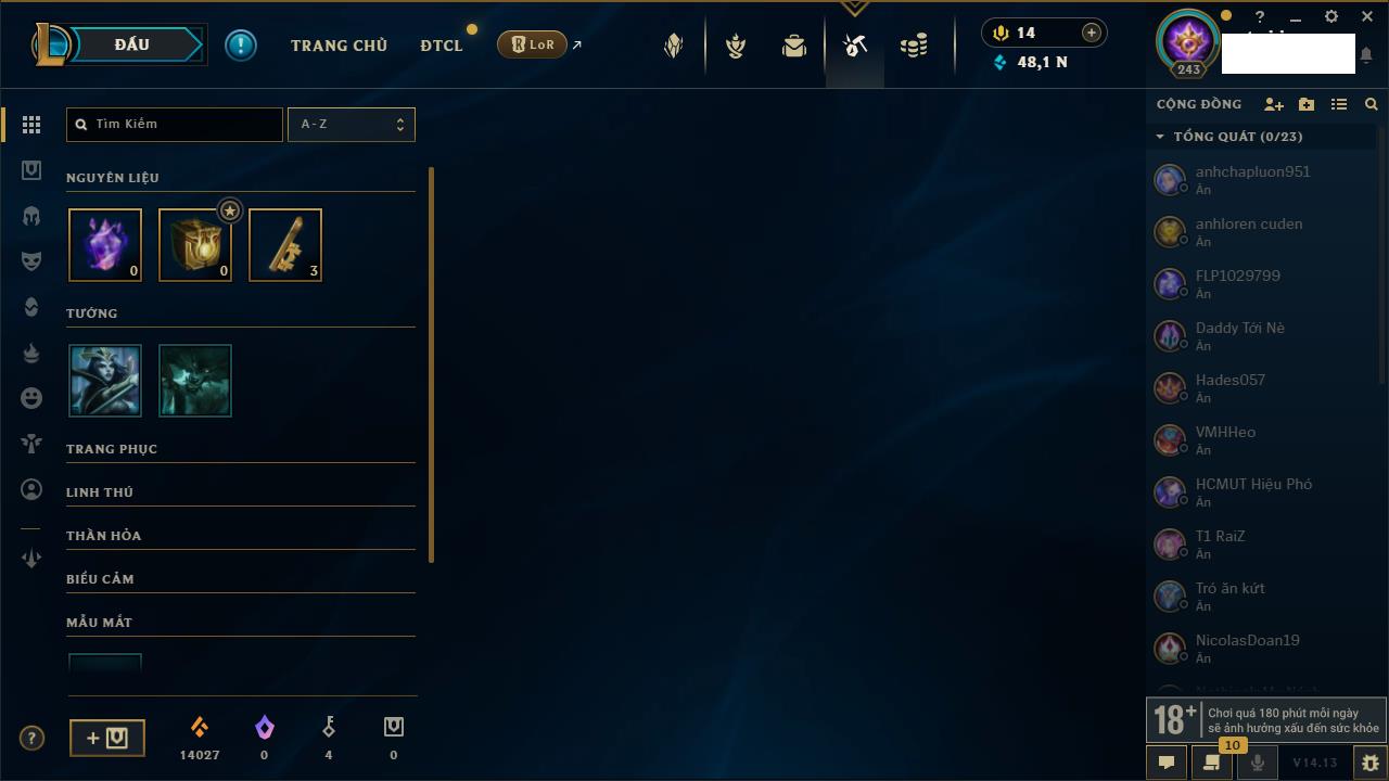 Rank Đơn: Vàng IVKhung: VàngTướng: 171 - Còn 48721 THXTrang Phục: 171Rank ĐTCL: Chưa RankLinh Thú: 27