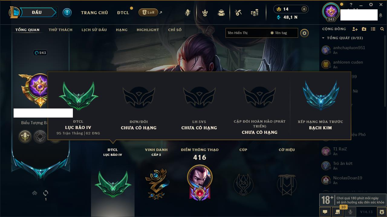 Rank Đơn: Bạc IIKhung: VàngTướng: 171 - Còn 332462 THXTrang Phục: 165Rank ĐTCL: Kim Cương IVLinh Thú: 181