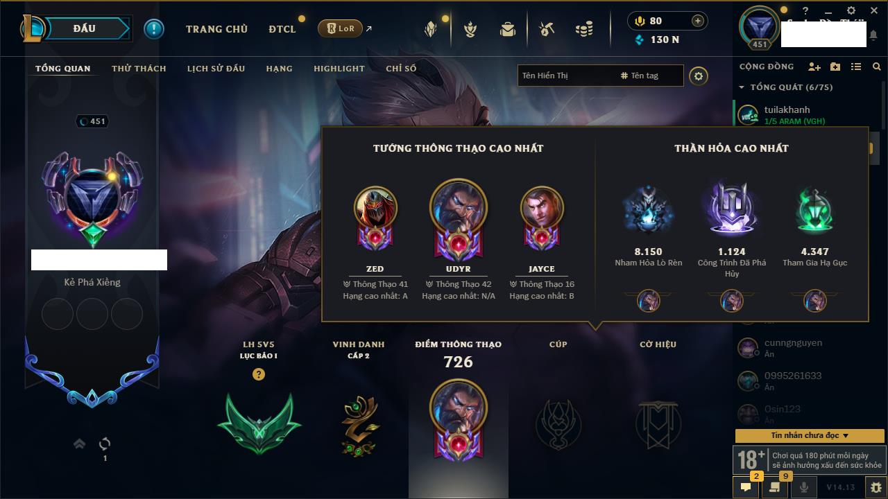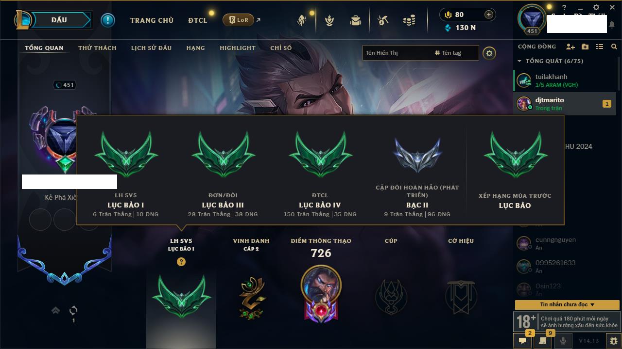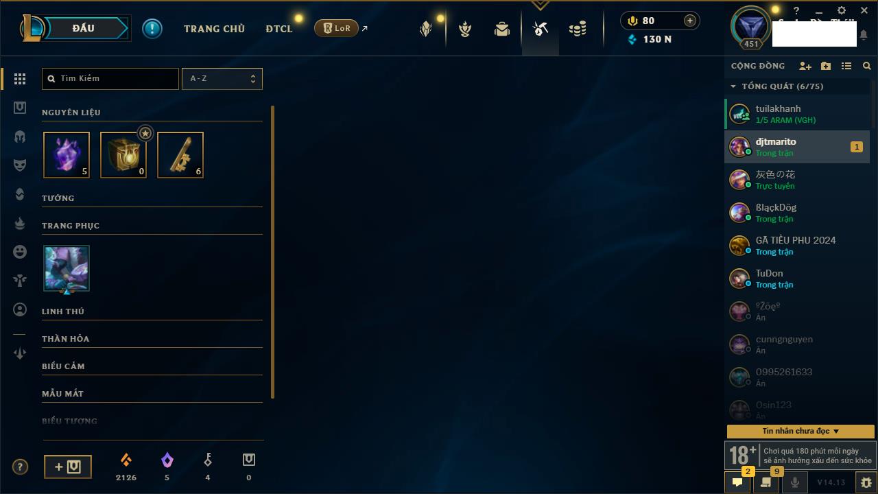 Rank Đơn: Vàng IKhung: BạcTướng: 171 - Còn 60584 THXTrang Phục: 286Rank ĐTCL: Vàng IIILinh Thú: 117