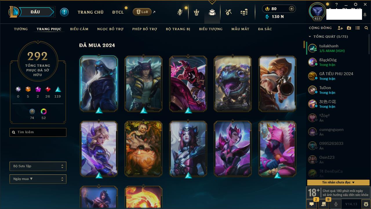 Rank Đơn: Vàng IIIKhung: VàngTướng: 171 - Còn 88128 THXTrang Phục: 329Rank ĐTCL: Chưa RankLinh Thú: 41