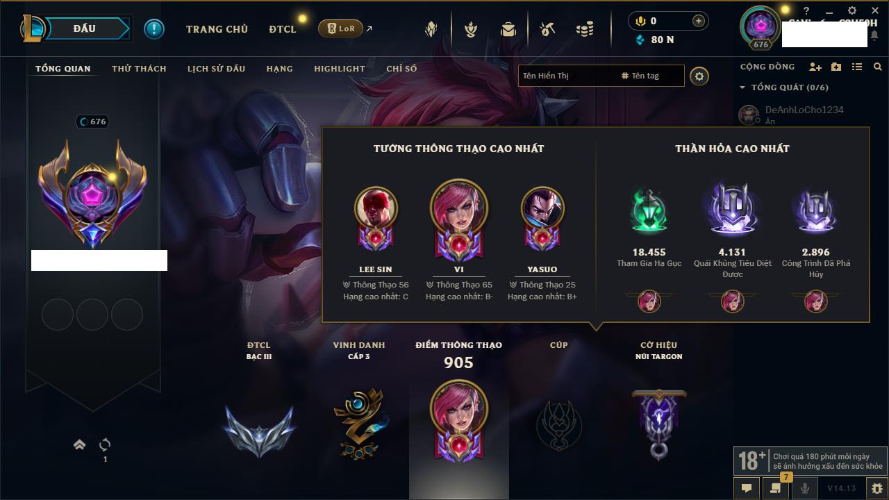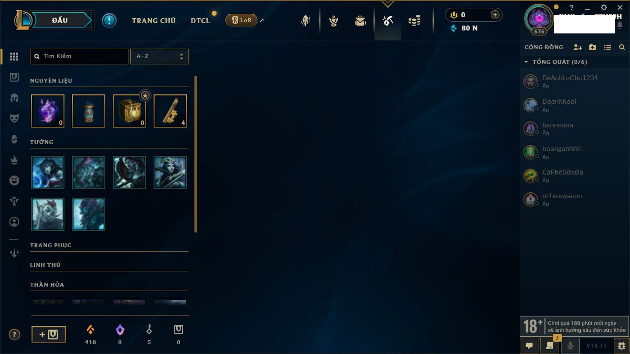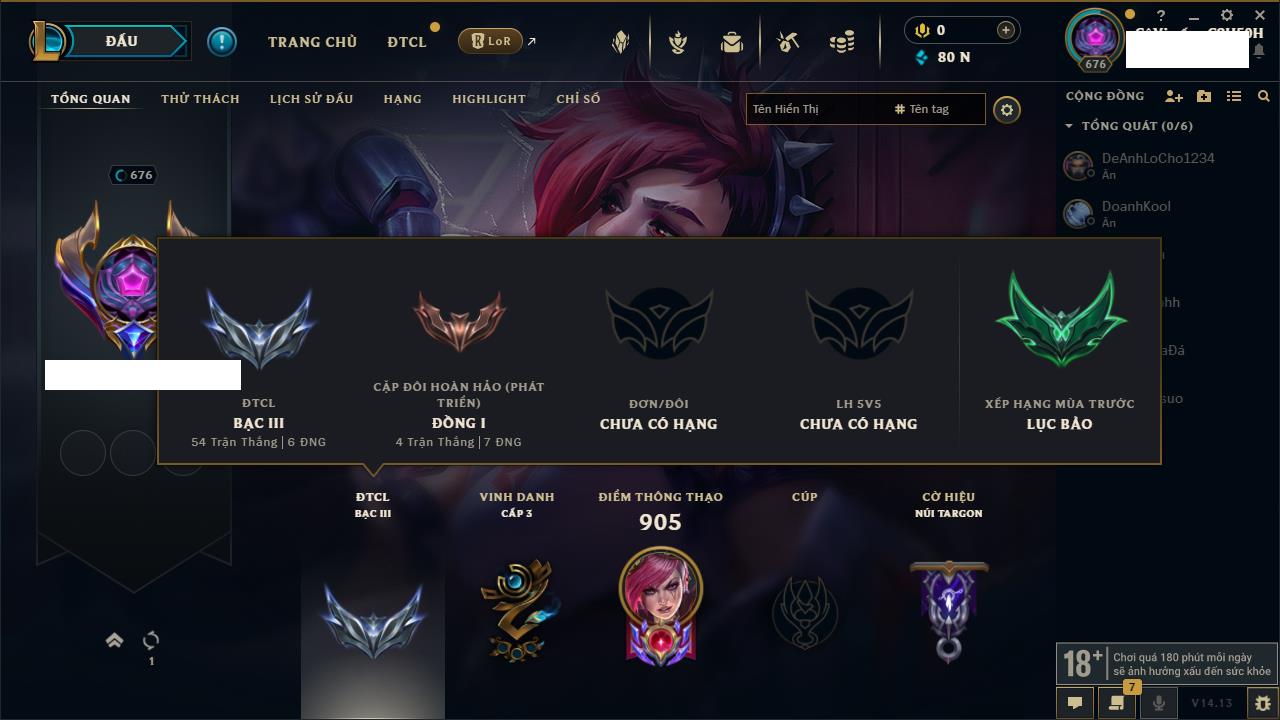 Rank Đơn: Vàng IKhung: BạcTướng: 171 - Còn 60584 THXTrang Phục: 286Rank ĐTCL: Vàng IIILinh Thú: 117