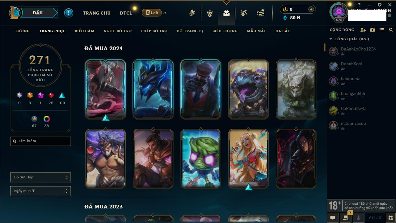 Rank Đơn: Vàng IIIKhung: VàngTướng: 171 - Còn 88128 THXTrang Phục: 329Rank ĐTCL: Chưa RankLinh Thú: 41