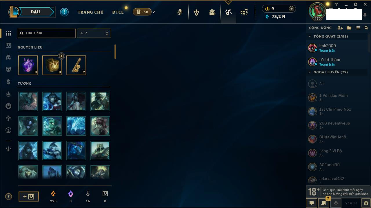 Rank Đơn: Chưa RankKhung: Chưa có khungTướng: 169 - Còn 43188 THXTrang Phục: 205Rank ĐTCL: Chưa RankLinh Thú: 259