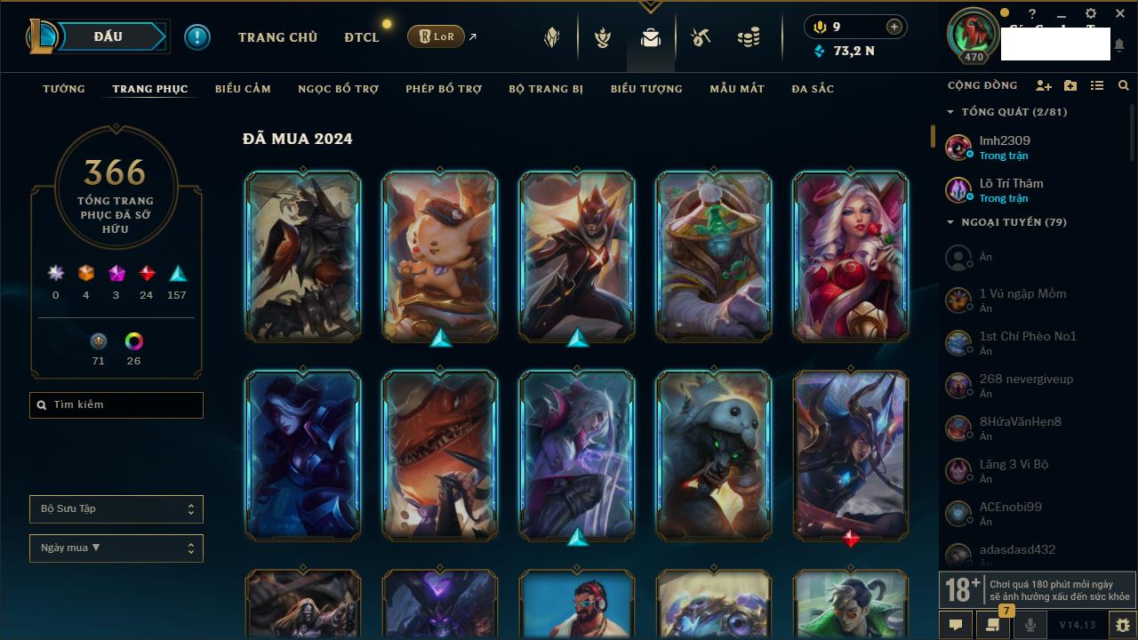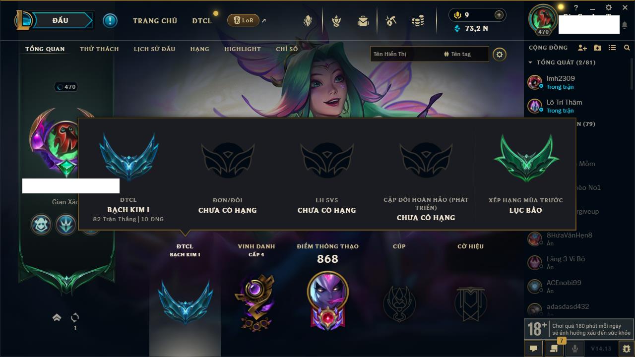 Rank Đơn: Bạch Kim IVKhung: Bạch kimTướng: 172 - Còn 326966 THXTrang Phục: 234Rank ĐTCL: Kim Cương IVLinh Thú: 167
