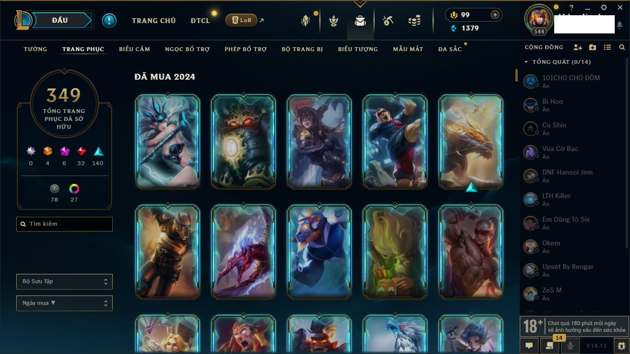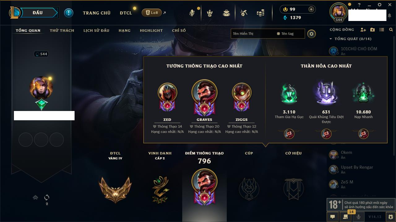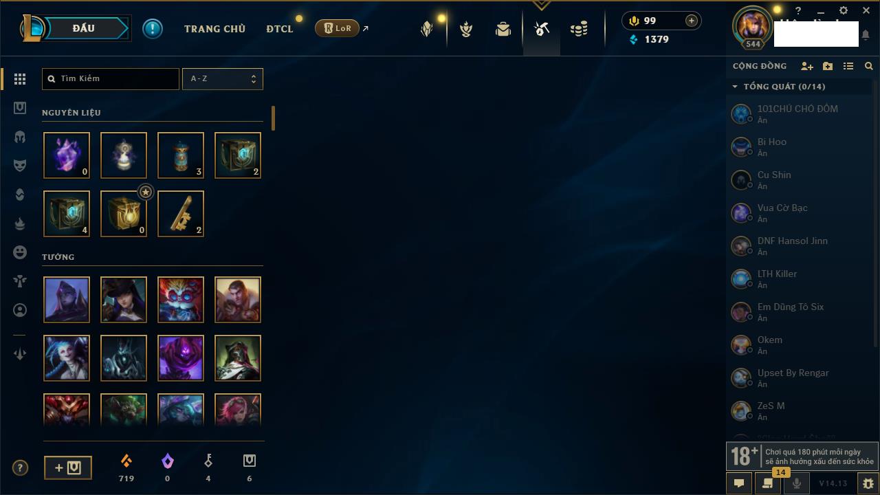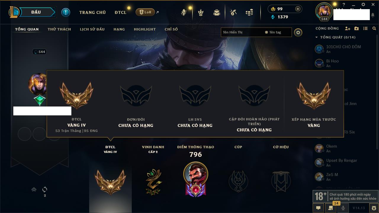 Rank Đơn: Bạc IIKhung: Bạch kimTướng: 169 - Còn 81813 THXTrang Phục: 301Rank ĐTCL: Chưa RankLinh Thú: 140