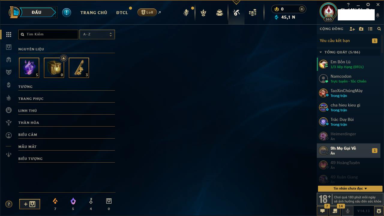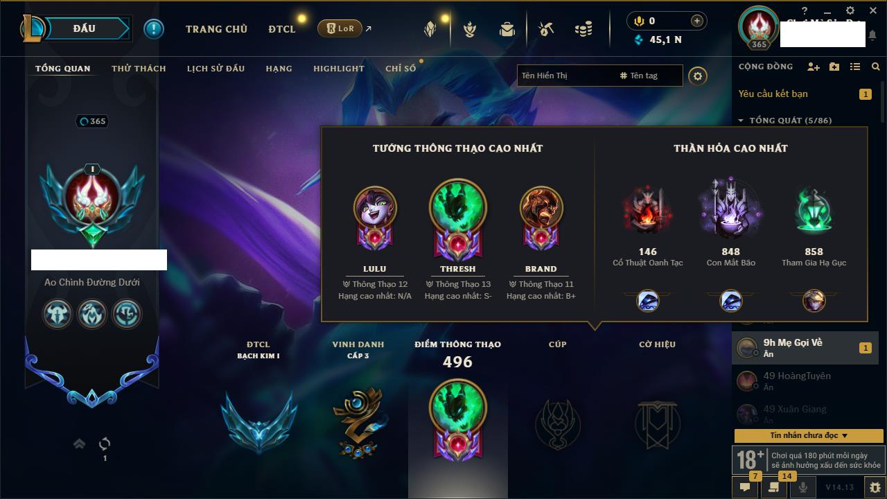 Rank Đơn: Vàng IVKhung: BạcTướng: 166 - Còn 180925 THXTrang Phục: 163Rank ĐTCL: Chưa RankLinh Thú: 67