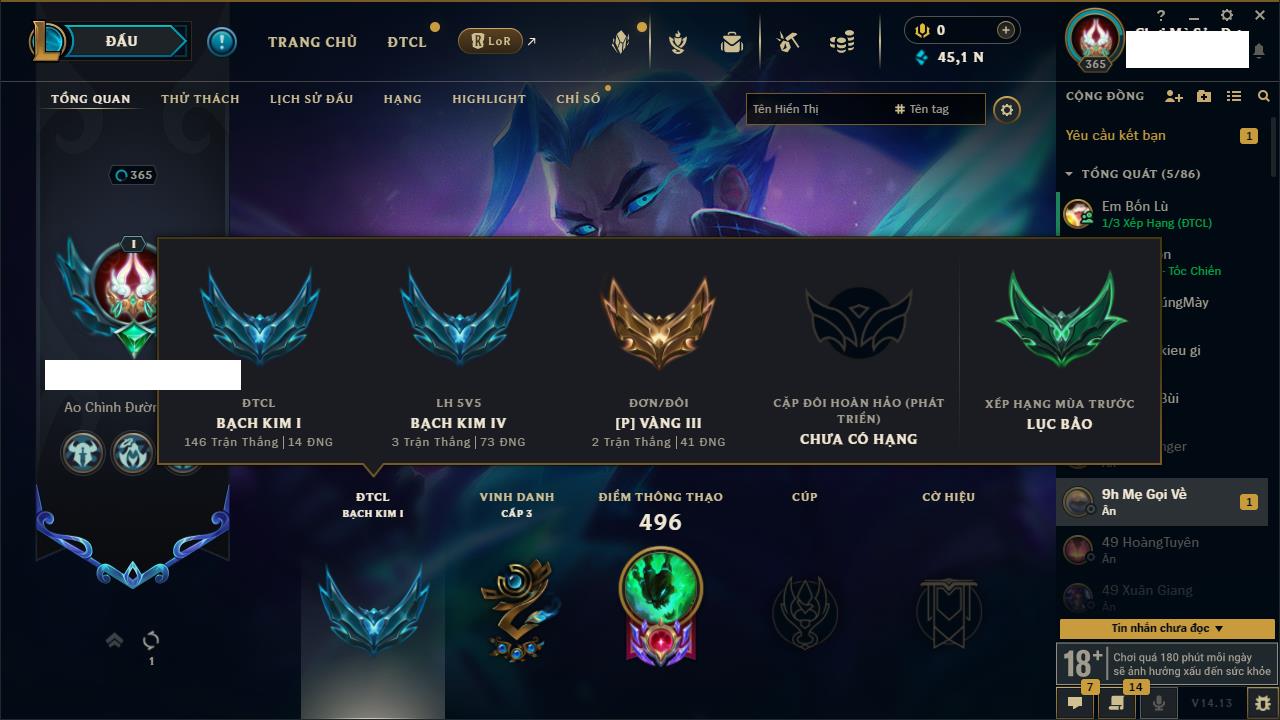 Rank Đơn: Bạc IIKhung: VàngTướng: 171 - Còn 332462 THXTrang Phục: 165Rank ĐTCL: Kim Cương IVLinh Thú: 181